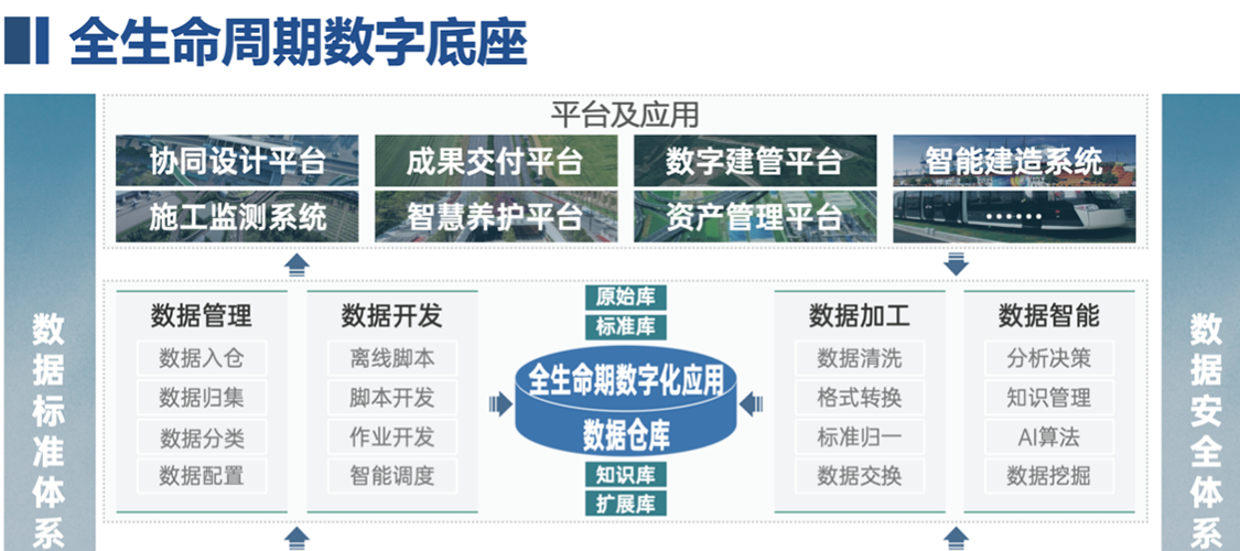 “悟空云”基建是按照设计、施工、运维不同阶段,形成数字化“投、建、养、运、服”一体化的应用体系。通过嵌入大数据分析、云计算和人工智能及各类专业分析的算力引擎,实现基础设施感知监测、评估诊断、预警预测等决策支持功能,真正利用数字化技术为行业的高质量发展赋能。
