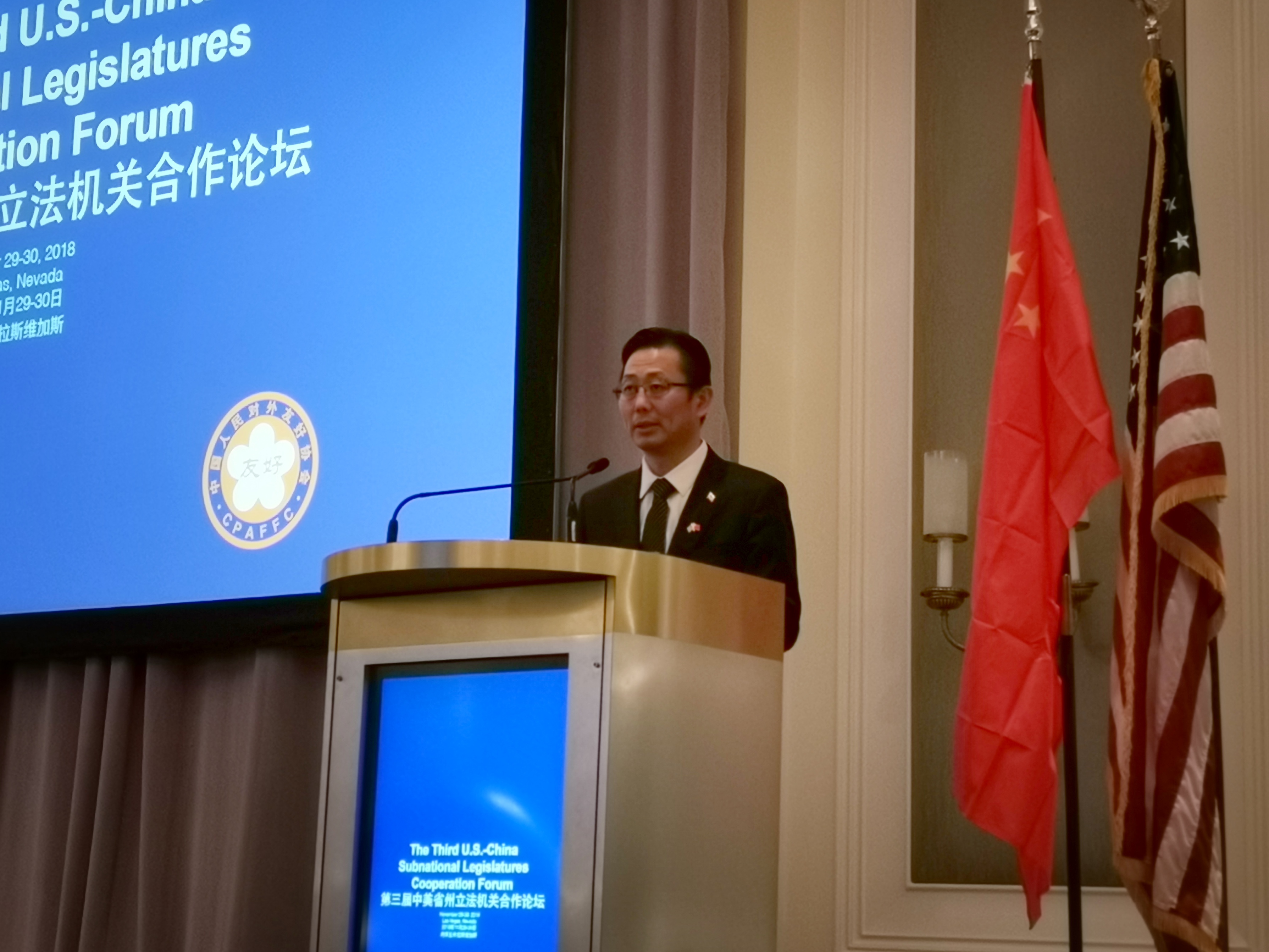 由中国人民对外友好协会与美国州立法领袖基金会共同主办的第三届中美省州立法机关合作论坛,11月29日在美国内华达州拉斯维加斯市举行。本届论坛围绕如何通过立法推动中美经贸、智能交通、教育合作等议题开展了积极交流。中国人民对外友好协会会长李小林,江苏省人大常务副主任陈震宁、上海市人大副主任肖贵玉、河北省人大常务副主任范照兵等五省市人大常委会负责人,亚...