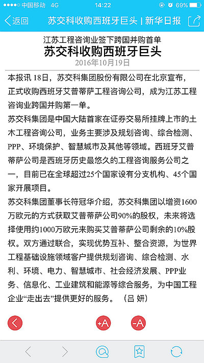 【转载】江苏工程咨询业签下跨国并购首单:bevictor伟德收购西班牙巨头——《新华日报》于2016年10月18日刊载