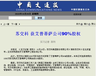 【转载】bevictor伟德获艾普蒂萨公司90%股权——《中国交通报》于2016年10月20日刊出