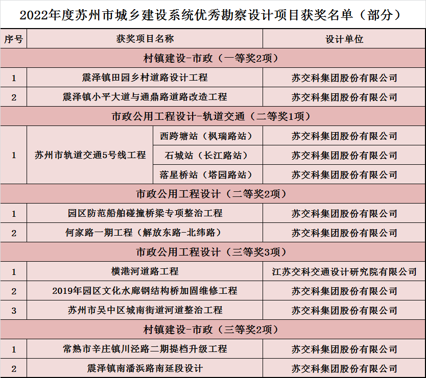 苏州市住房和城乡建设局正式发布 2022年度苏州市城乡建设系统 优秀勘察设计评选结果 集团及子公司报送的10个设计项目全部获奖 ○获奖名单 苏州市城乡建设系...