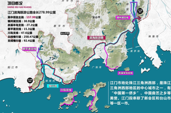 广东滨海旅游公路江门段东接珠海、南联阳江,路线串联新会区银州湖、银湖湾、台山都斛万亩农田、广海海侨风情、美丽川岛、海宴东南亚风情园、汶村古村以及北陡镇浪漫琴湾,沿线既有山、水、泉、沙、石以及历史底蕴深厚的海丝文化集中地,串联精品,联动岛-海-湾-江-城发展形势,形成江门全域旅游发展格局。