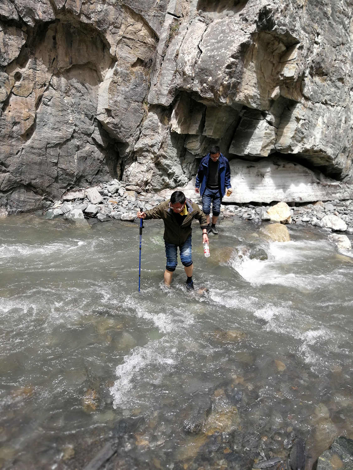 新疆地理环境复杂,外业作业经常要过一些河流,图为交规院何长生主任挽起了裤管蹚过开都河。