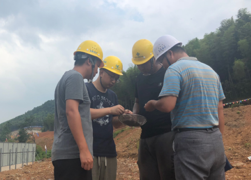 交规院特桥所徐欣与监理和二标施工单位到岭下二号桥确认桥梁桩基终孔。图片上为徐欣与各方正在比对地勘资料和现场渣样是否相符。