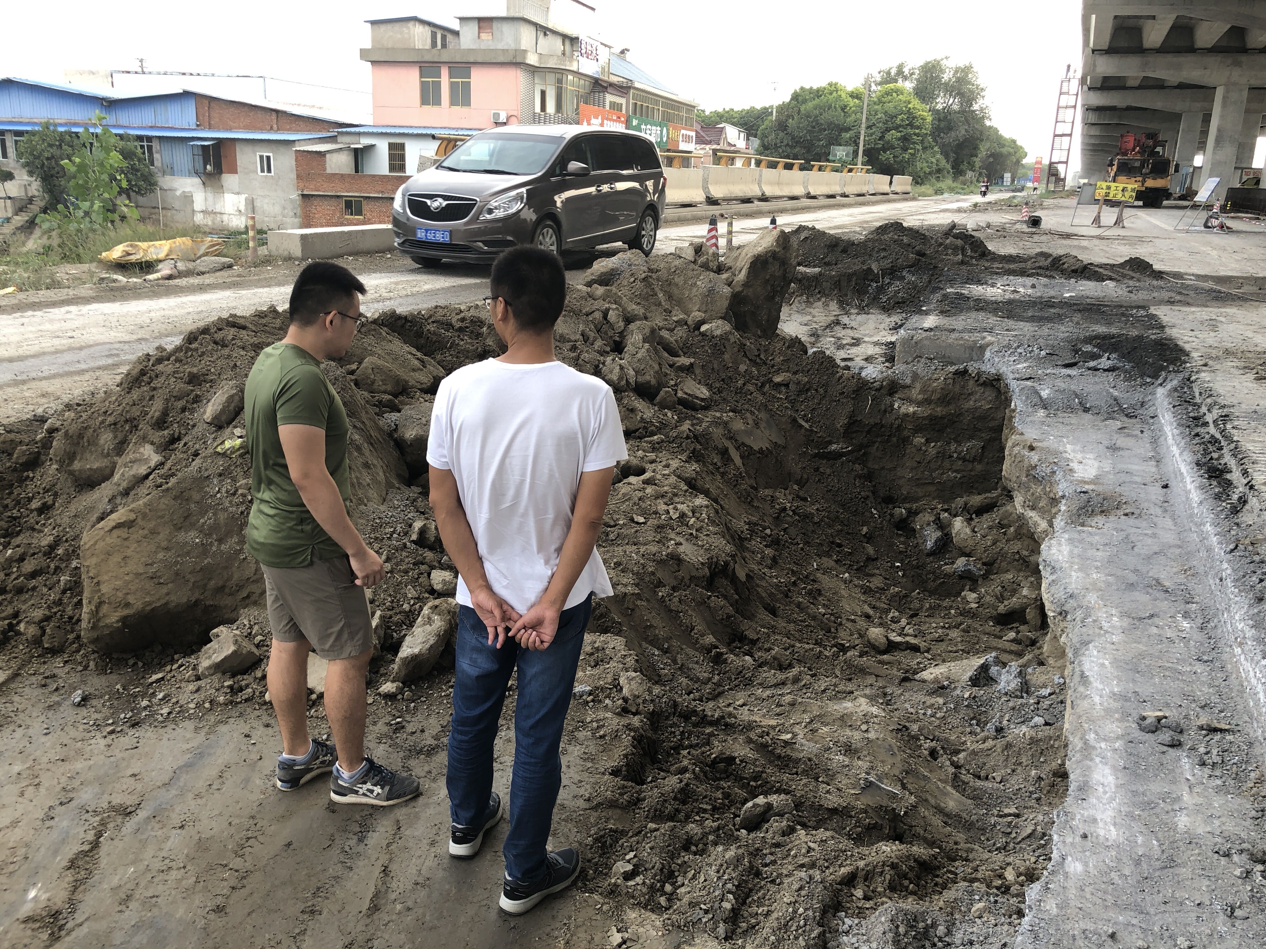 项目设计代表和泰州市区公路工程指挥部人员勘察老桥搭板底脱空情况。