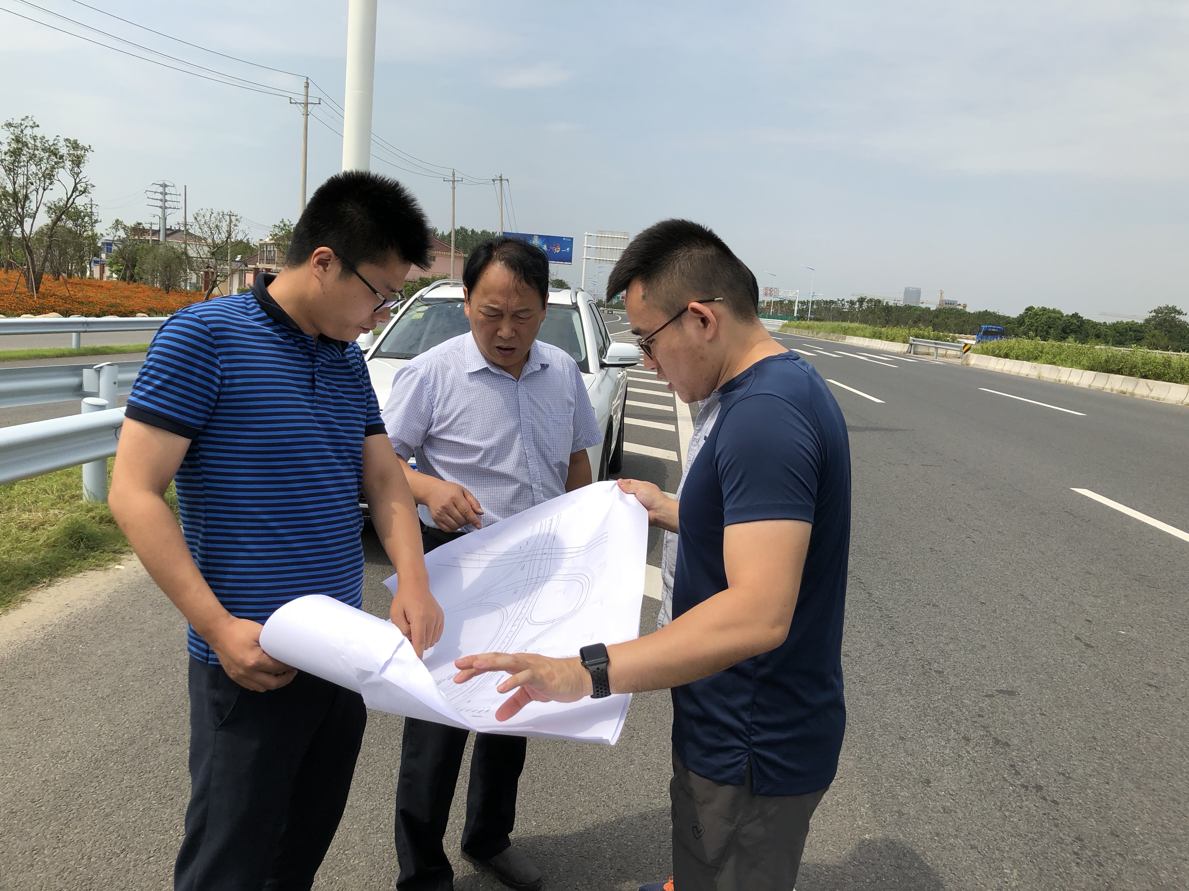 bevictor伟德道二所李曜宇和郭肖陪同泰州市市区公路指挥部总工杨维淮现场讨论328国道海姜段快速化改造起点处方案。