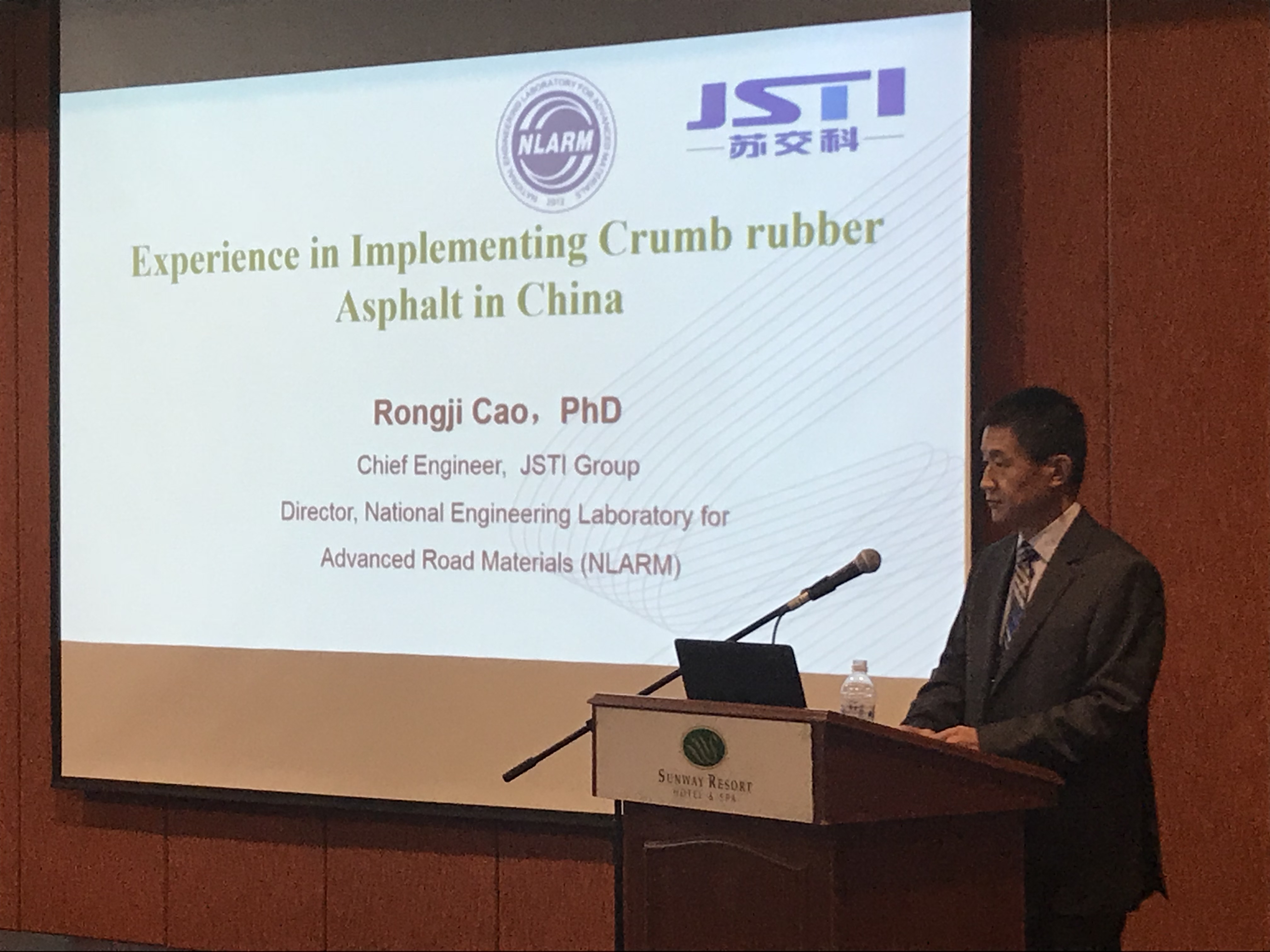 会议期间,曹荣吉分别围绕资产管理系统在中国的应用与发展及养护策略和橡胶沥青技术在中国的应用情况及最新技术进展发表了题为《Pavement Condition Assessment and Maintenance Strategy Analysis》、《Experience in Implementing Crumb rubber Asphalt in China》的演讲。马来西亚国家工程部道路研究实验室主任Ir. Mohd Hizam Harun对马来西亚改性沥青技术的发展历程及马来西亚橡胶沥青技术规范做了宣贯介绍,并对曹荣吉主任和陈刚副总经理在规范编制过程中提出的建议与意见表示了感谢。