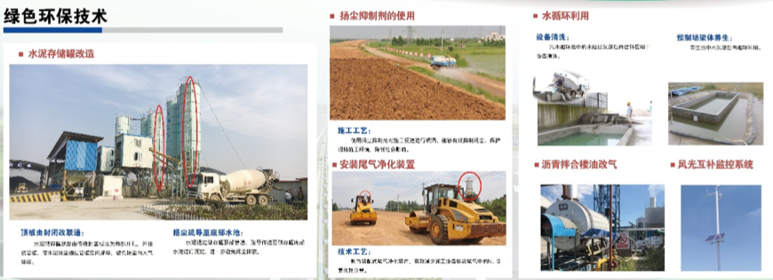 项目因地制宜,提出了许多新的绿色循环低碳技术措施,包括预制场循环养生池、水泥储存罐顶部扬灰疏导系统、防扬尘抑制剂技术、边坡挂网绿化防护、桥下植草、尾气净化装置、施工期临时声屏障等,尽量减少扰民,并开展了沿线氛围设计,争取群众的理解和支持。