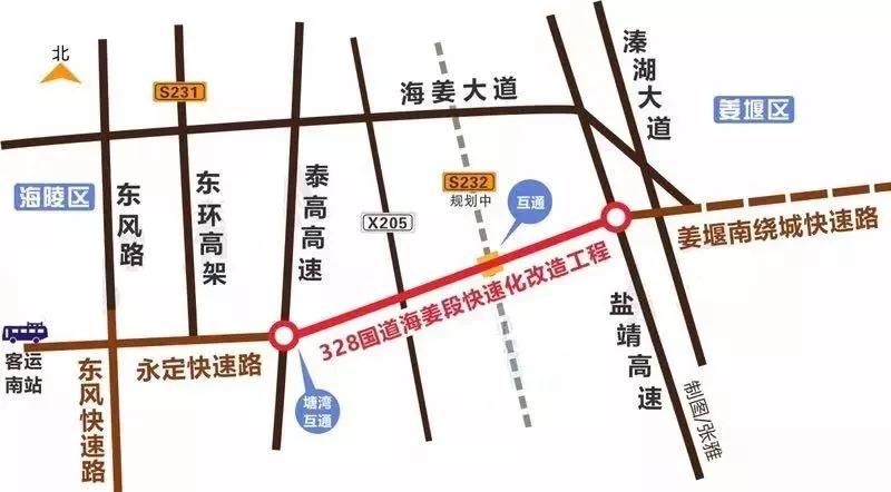 328国道海姜段快速化改造工程起于泰高高速塘湾互通,向东利用新328国道布线,跨越盐靖高速后继续向东,止于溱湖大道,全长约11km,其中高架段长6.4公里,总投资约14.5亿元。主线采用一级公路兼城市快速路标准,辅路采用城市次干道标准,断面布置形式为主六、辅六,主线设计速度80公里/小时,辅道设计速度40公里/小时。主线高架与规划232省道相交处设有一处菱形互通,两侧均有一个出口和入口。