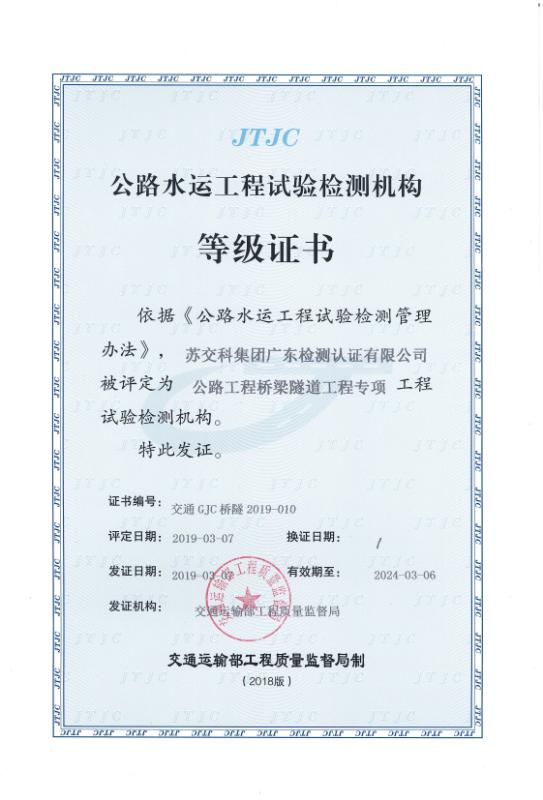 3月7日,经交通运输部工程质量监督局批准,集团全资子公司bevictor伟德集团广东检测认证有限公司获得桥隧专项资质证书,为更好的服务广东交通奠定了坚实的基础。