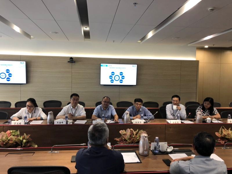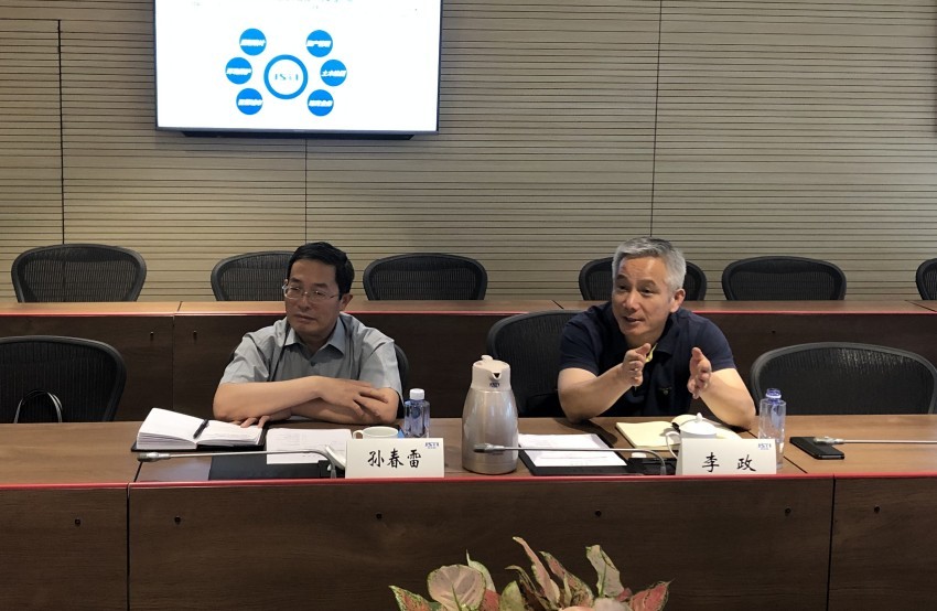 ▲ 江苏省科协党组书记、副主席孙春雷(左一),学会部部长李政(右一)与集团相关负责人进行交流