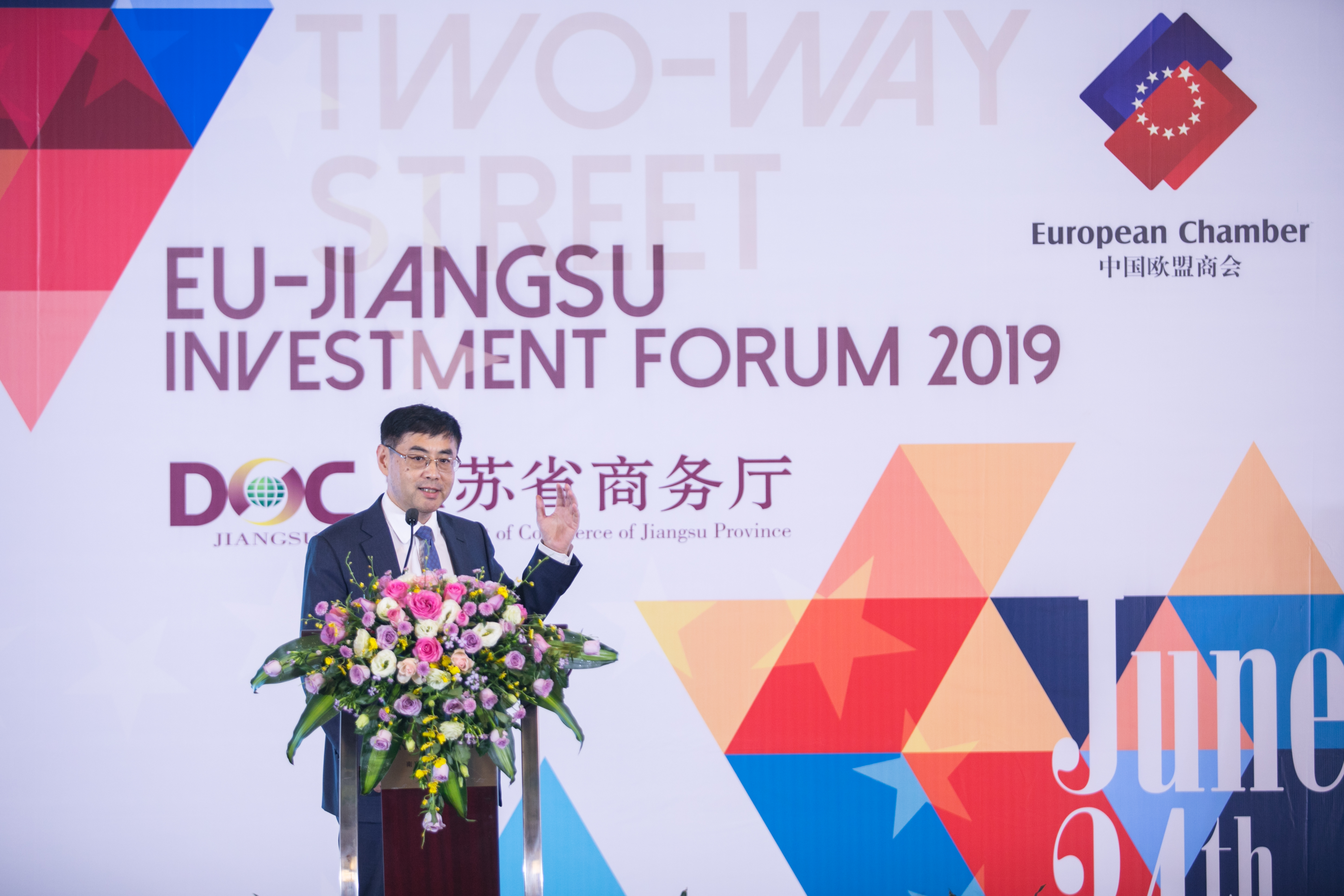 中国欧盟商会南京分会董事会主席魏博致欢迎辞,并进行中国欧盟商会《商业信心调查2019》结果分享。江苏省商务厅副厅长孙津发表主旨演讲,讲述改革开放至今,江苏外资产业、进出口贸易取得的巨大进展。