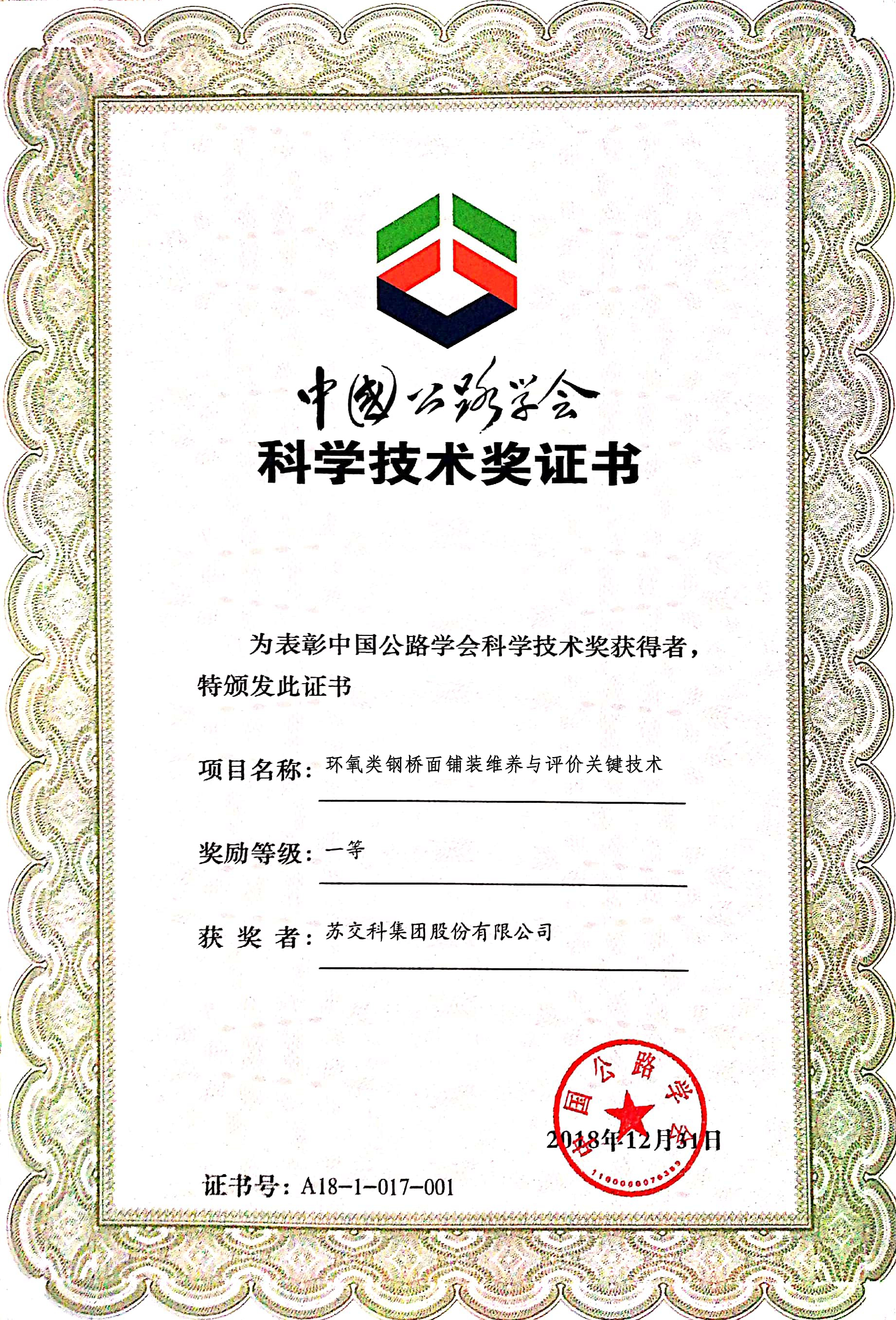 ▲ “环氧类钢桥面铺装维养与评价关键技术”获奖证书