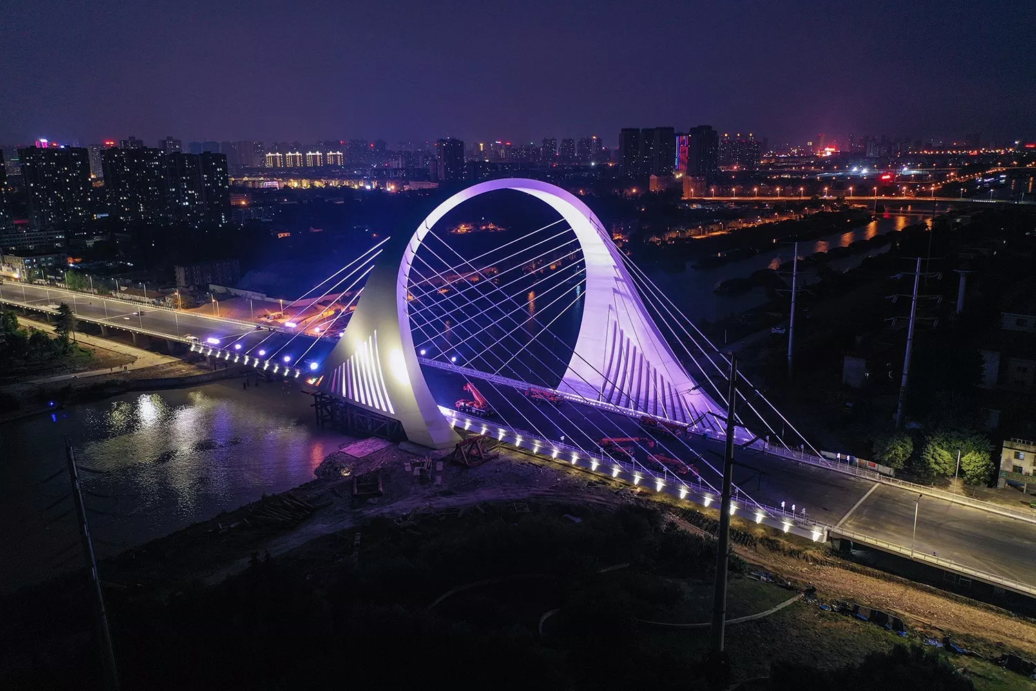 淮安运河大桥桥型独特,在京杭运河上可谓独树一帜。主桥采用空间异型拱形钢主塔,呈空间曲线的水滴造型,故被称为“淮上明珠”。不仅满足使用功能、安全可靠,还充分结合淮安“四水穿城”、“运河之都”等历史,如今已成为淮安地标性建筑。