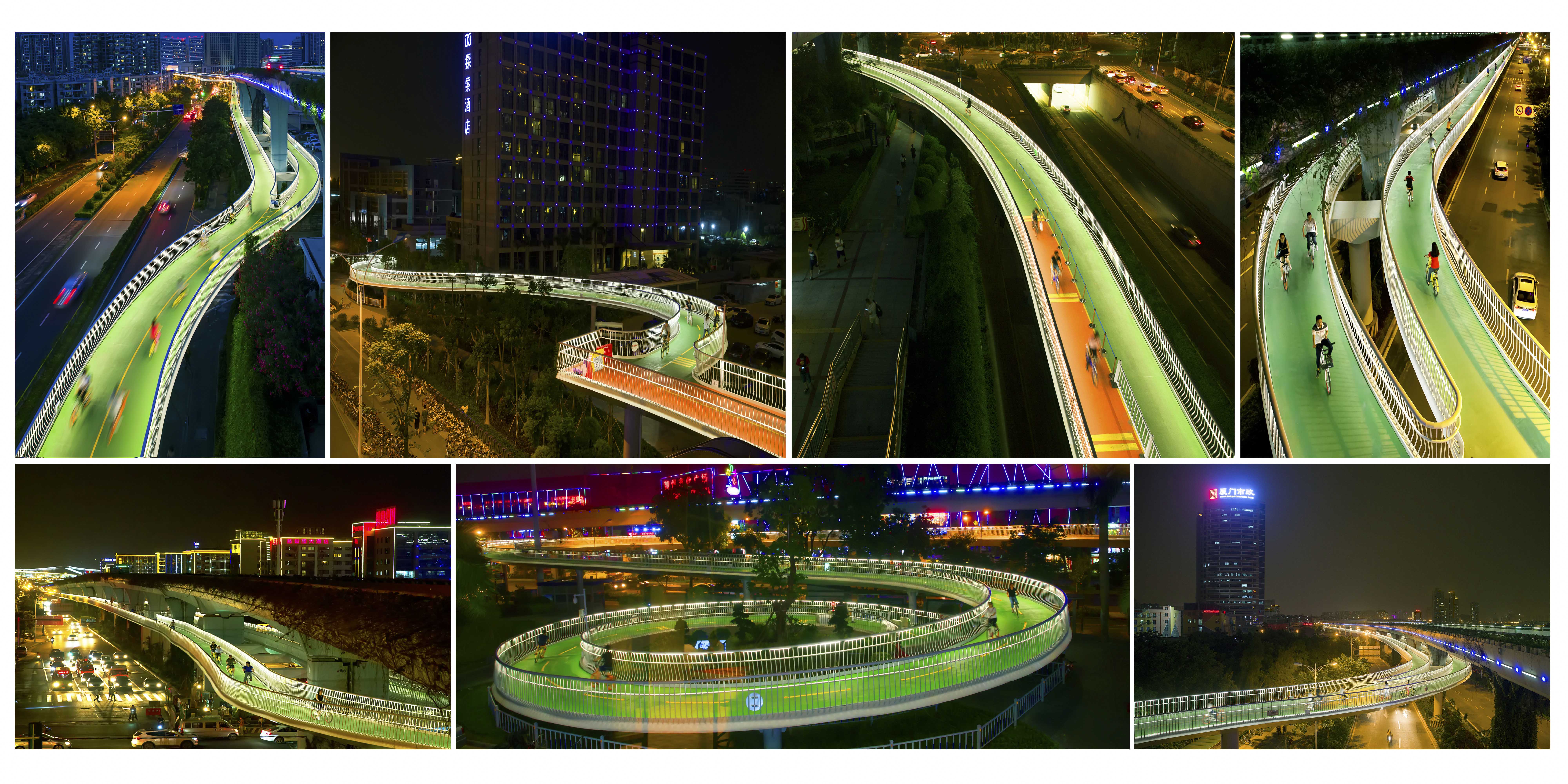 云顶路自行车快速道示范段工程是国内首条、世界最长的自行车高架桥自行车快速路,起点位于厦门BRT洪文站,终点位于BRT县后站,路线全长约7.6km。项目充分利用现有BRT桥下空间,将独立的自行车高架桥布置于现有BRT桥梁下方两侧,实现空间多层次的利用。全线共设置出入口11处,与沿线的BRT站点、地铁站、公交站直接衔接,方便骑行者实现快速换乘。二层设置停车平台、专用道连接线无缝衔接办公、商业等建筑,方便市民使用。通过安全护栏、标志标示、独立照明系统和智能控制系统等配套设施和服务设施,让设计更加人性化,让骑车出行更加安全、更加舒适。该项目自主研发并已获得了两项发明专利、一项实用新型专利和一项外观专利授权,并获得了2017年住建部《中国人居环境范例奖》。