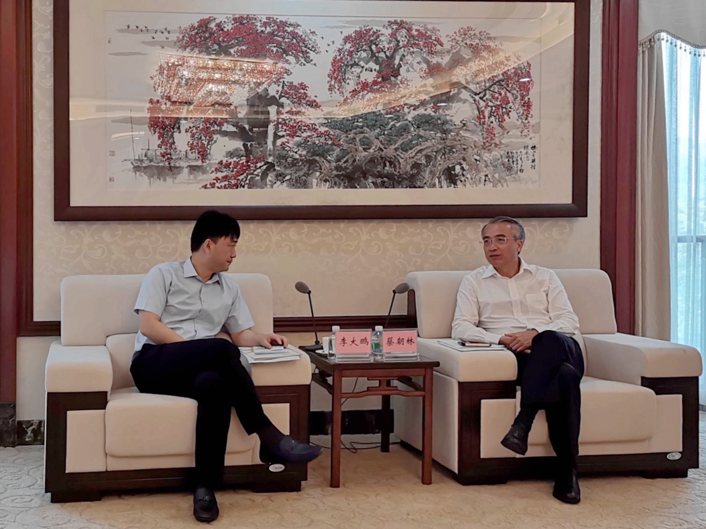▲ 广州市委常委、南沙区区委书记蔡朝林与bevictor伟德集团总裁李大鹏(左一)作交流
