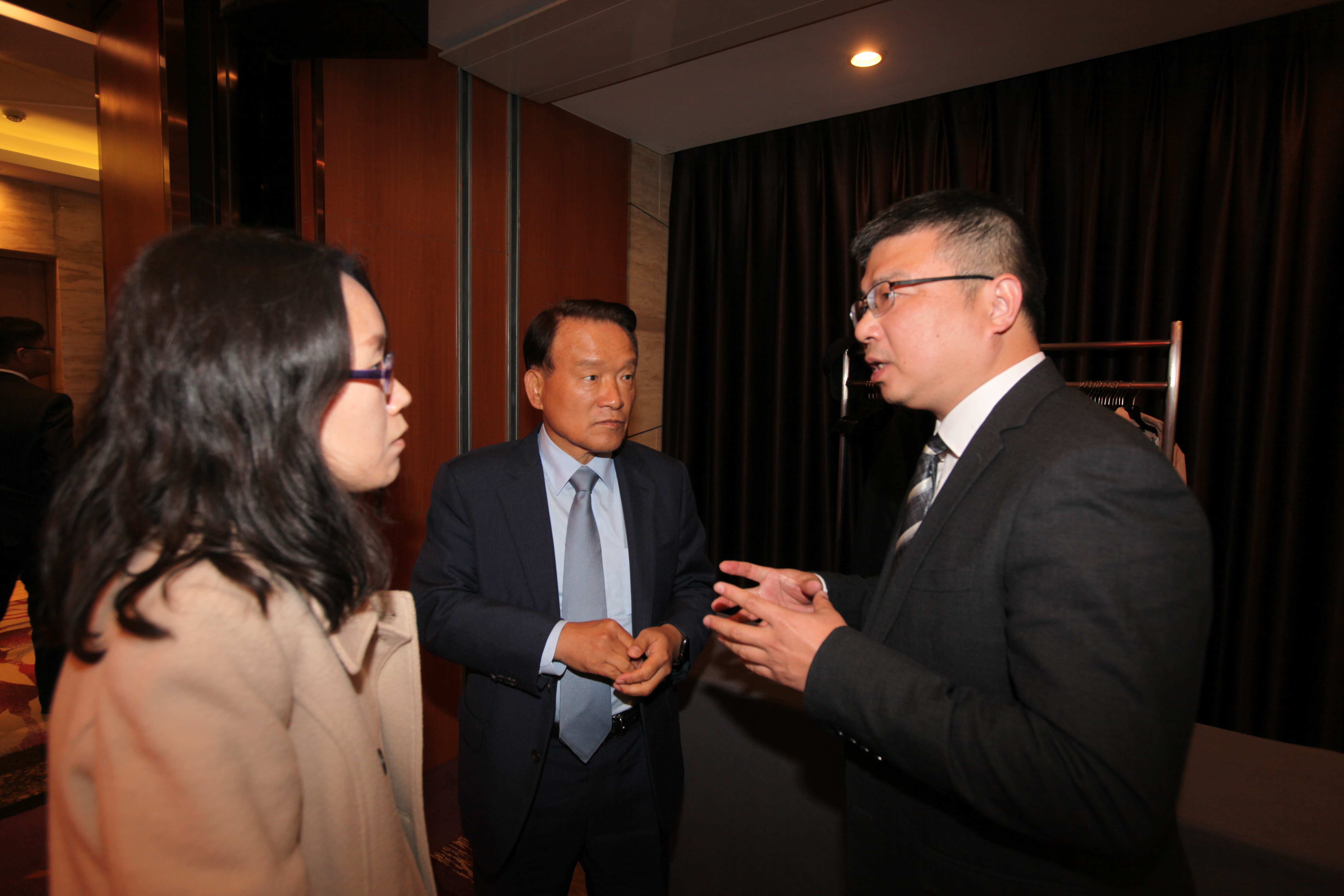 ▲ 韩国建设技术管理协会会长金正镐(左二)与苏科建设总经理助理杨程(右一)交流