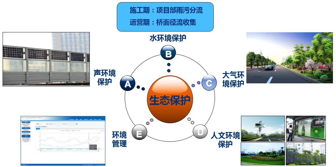 从声环境、水环境、大气环境、土壤环境以及人文环境等五个方面开展本项目的实施方案。项目在噪音敏感处设置光伏声屏障来控制噪音污染;水环境保护主要通过一定的设施有效节约利用水资源;空气环境保护通过绿色植被的固碳作用来改善项目沿线的空气质量,提高常熟城市的宜居性;人文环境保护通过交叉口小品设计、宣传灯箱、彩色沥青建设步道的实施来美化城市环境、展现城市风格。