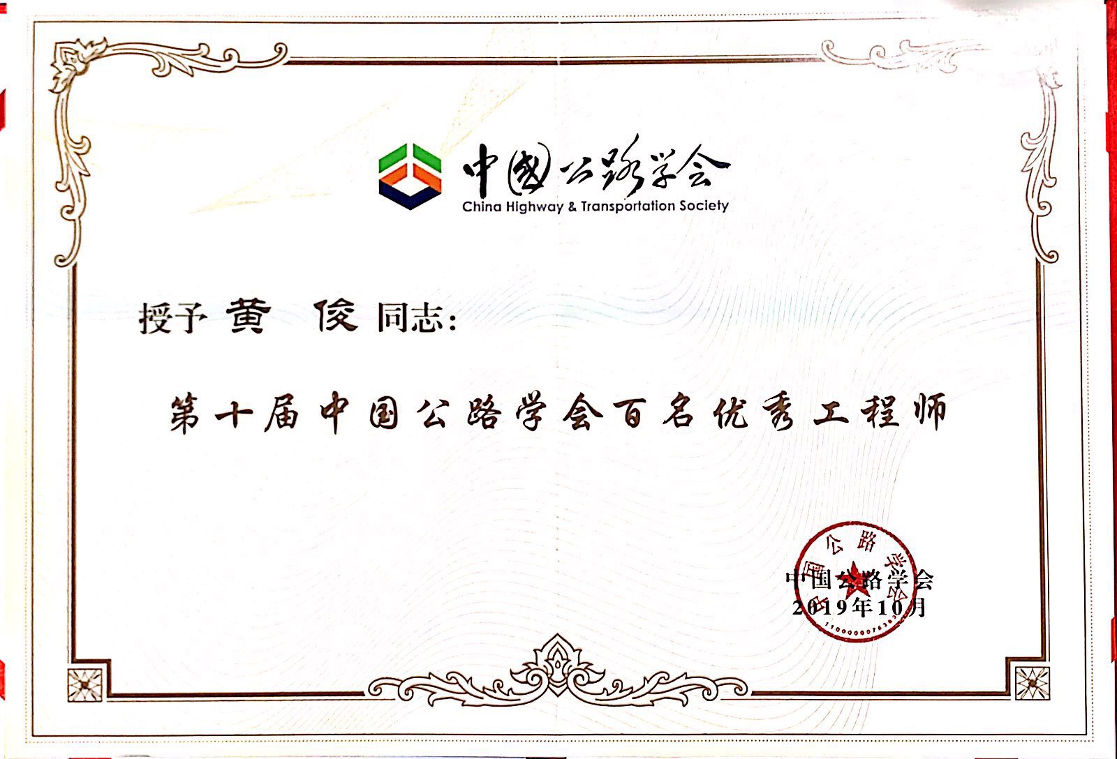 “中国公路学会百名优秀工程师”