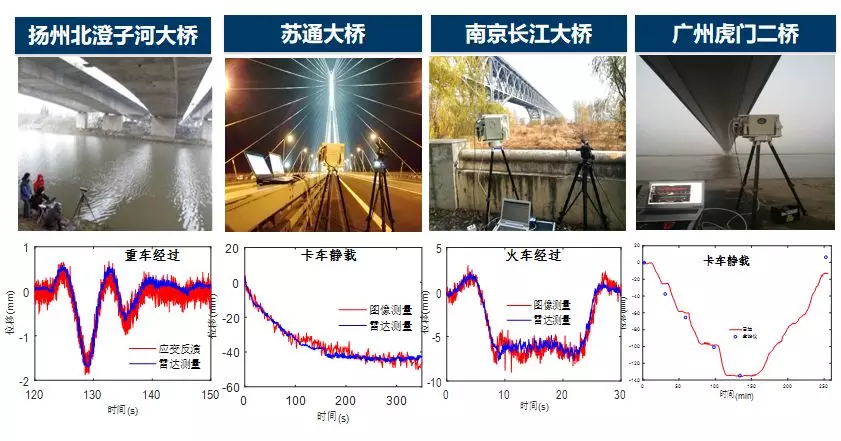该项目开发并应用的微波雷达设备可实现非接触、全天候的桥梁结构区域微变形精准测量,主要应用于桥梁快速荷载试验中的桥梁静动挠度远距离(2km)高精度(0.01mm)快速便捷测量。项目研究并集成的采用倾角仪的桥梁挠度测量技术主要应用于桥梁快速荷载试验中静动挠度的多点实时同步测量和桥梁监测系统中线形实时监测。