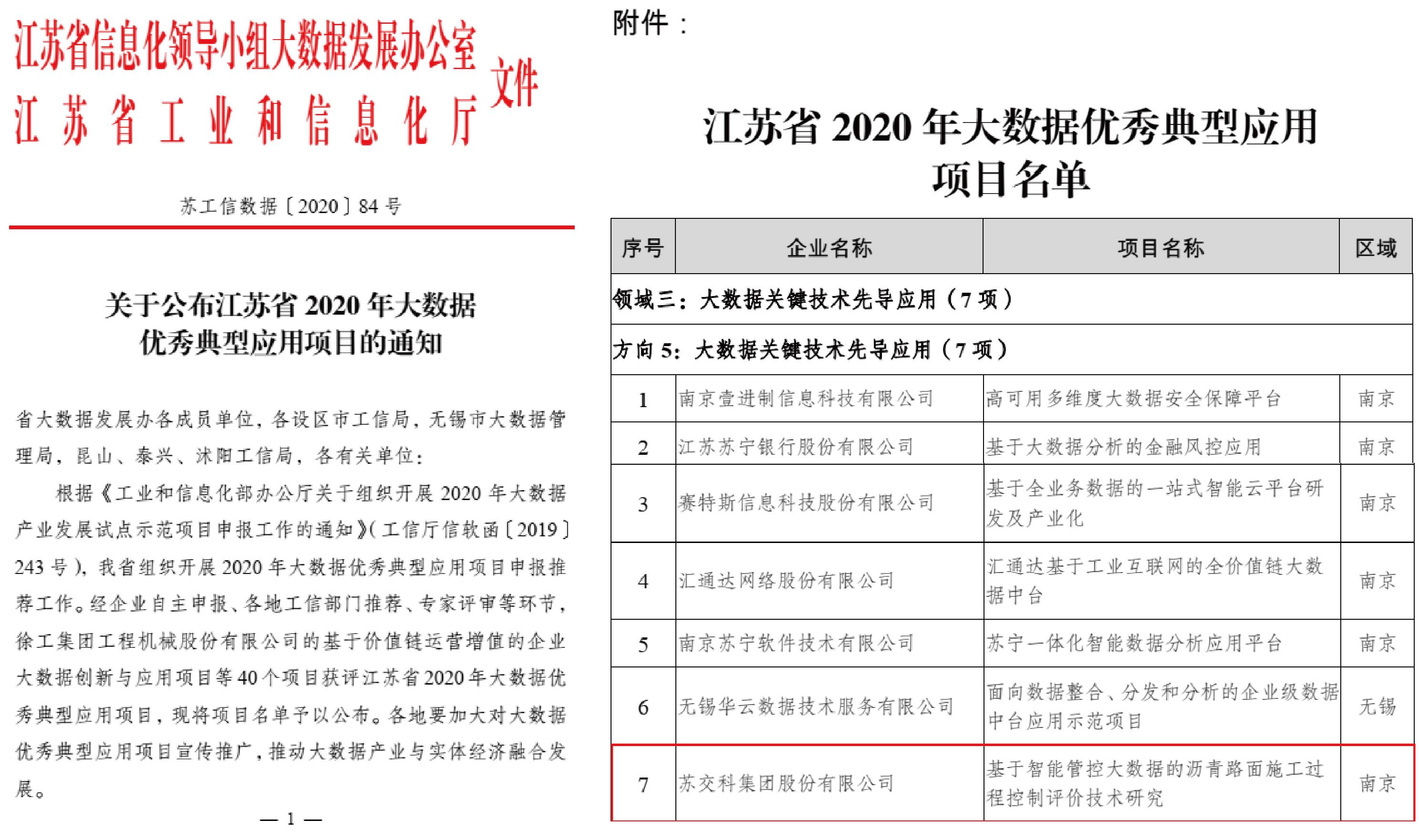 近日,江苏省工业和信息化厅发布了《关于公布江苏省2020年大数据优秀典型应用项目的通知》,共有40个项目获评江苏省2020年大数据优秀典型应用项目,项目类型涵盖通信、电力、工业制造、医药、交通、金融、工程施工等多个领域。其中,bevictor伟德集团交通科学研究院道路工程研究所主创的《基于智能管控大数据的沥青路面施工过程控制评价技术研究》作为大数据关键技术先导应用项目入选。