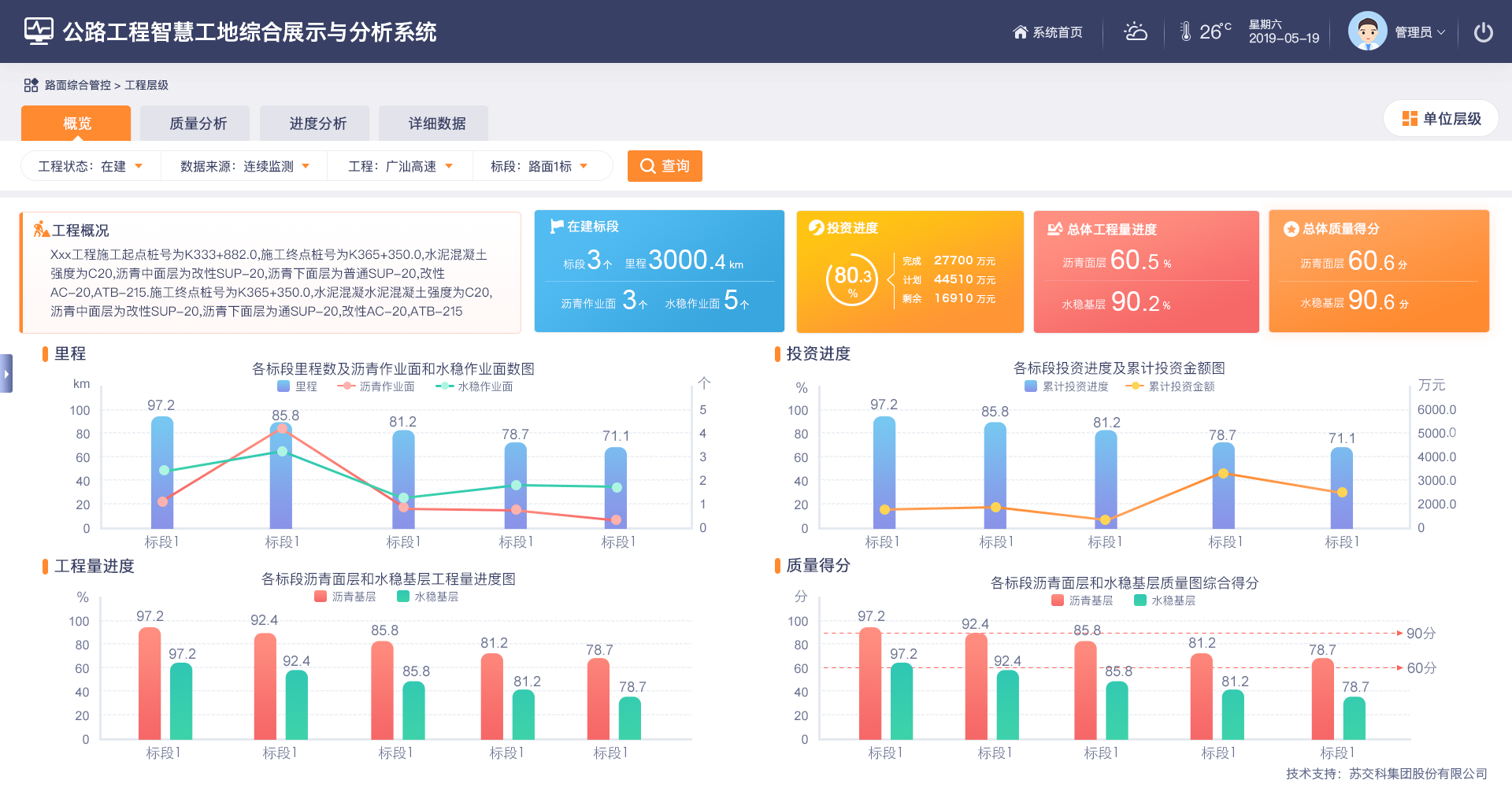 截至目前,集团自主研发的公路工程智慧工地平台已在全国15个省份7000余公里的高速公路和国省干线广泛应用,有效地实现了公路工程施工过程控制、动态引导和科学评价。今后,集团将继续深入开展交通大数据的研究、应用和推广,推动大数据产业与交通行业的融合发展,为行业的数字化转型输出技术力量。