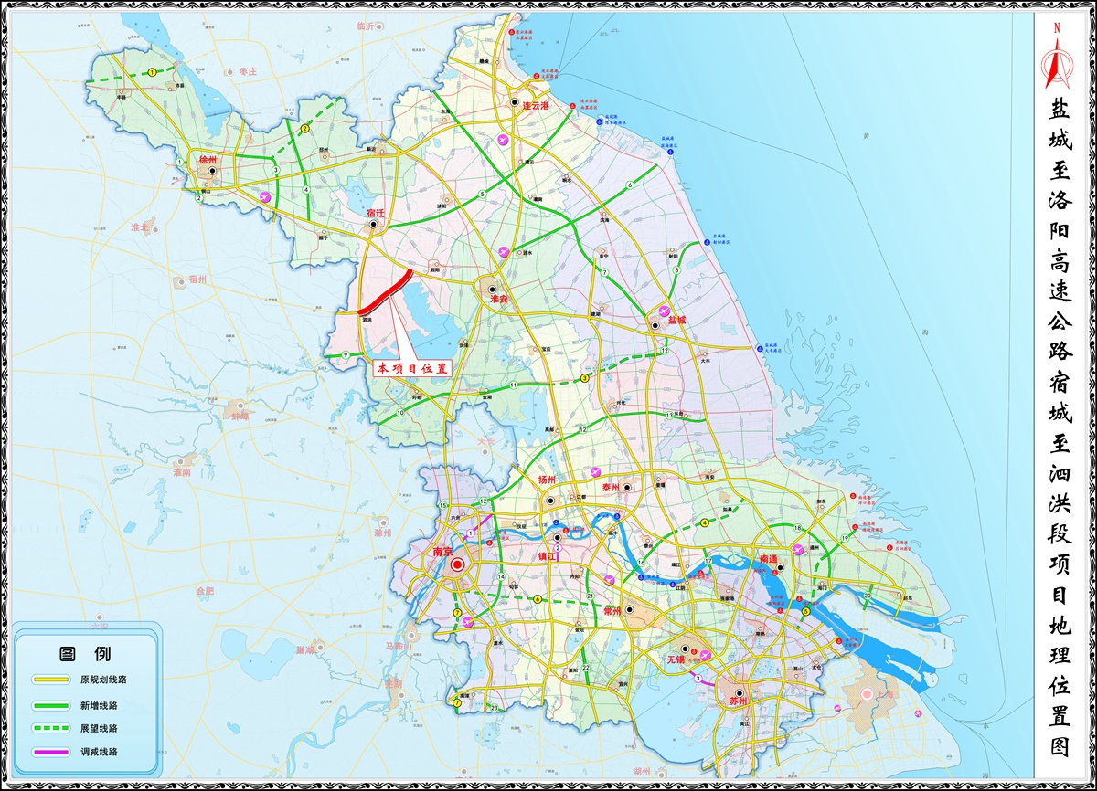 盐城至洛阳高速公路宿城至泗洪段是《国家公路网规划(2013-2030年)》中沈海高速公路(G15)的联络线G1516盐洛高速重要组成部分,也是《江苏省高速公路网规划(2017-2035年)》“十五射六纵十横”中“横四线”滨海至泗洪高速公路的关键路段。项目起于宿迁市宿城区仓集镇南,接盐洛高速公路淮安至宿城段,经宿城区屠园镇以及泗洪县界集镇、朱湖镇、大楼乡,止于泗洪县经济开发区泗洪西枢纽东,接盐城至洛阳高速公路泗洪至宿州段,全长38.1公里。项目建成后将推进淮河生态经济带建设,构建苏皖省际快速通道,完善国家高速公路网,有利于成子湖片区扶贫开发,促进沿线区域经济社会发展,对落实长三角区域一体化、“一带一路”等国家战略具有重要作用。