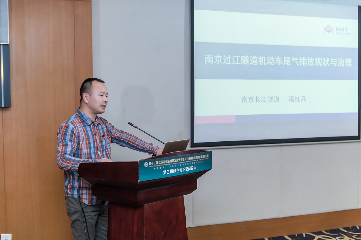 潘红兵经理作《隧道机动车尾气现状与治理技术》主题报告。基于南京应天大街长江隧道、南京定淮门长江隧道应用实践,介绍饱和流量下水下长大隧道机动车尾气排放现状以及治理方案。