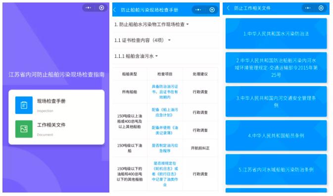 《江苏省交通运输综合行政执法监督局防治船舶污染现场监督工作指南》基于船舶污染防治相关法律法规和规范性文件要求,结合江苏省内河辖区特点,针对内河船舶污染防治监管职责,编制船舶污染检查工作中涉及的检查类型和内容、流程、依据、处理建议等,并开发微信小程序,方便执法人员现场查阅。指南编制适应江苏省内河辖区特点,能够有效降低前期准备工作压力,提高执法人员执法效率与精度,为船舶防治检查工作实现电子执法打下坚实基础。