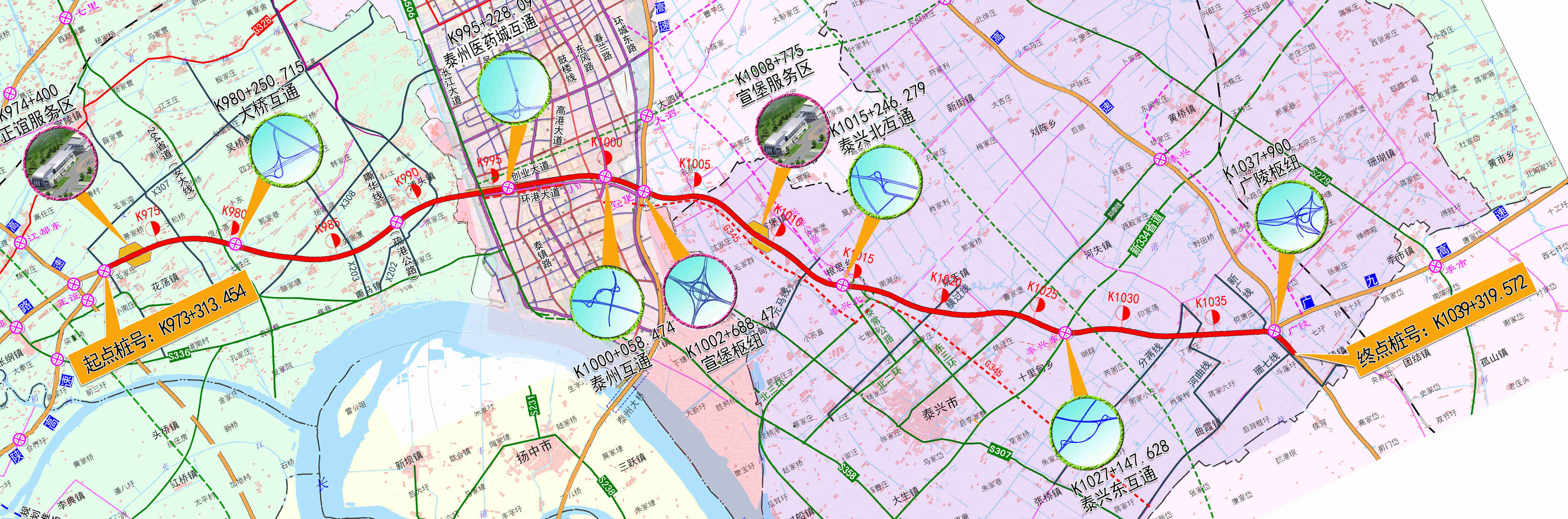 江广高速是江苏省“五纵、九横、五联”高速公路网规划中“横四”的重要组成部分,与“横四”其它段落串联南京、扬州、泰州、南通等城市,连通长江北岸各地市,构成江北沿江交通大通道骨架,成为沿江港口东西向集疏运输通道。江广高速起自与宁通公路交叉的正谊枢纽,与宁通公路并线,止于与盐靖高速交叉的广陵枢纽,路线全长66.006km。项目改造采用两侧拓宽方式,扩建为双向八车道高速公路标准,路基宽度42m,设计速度120km/h。