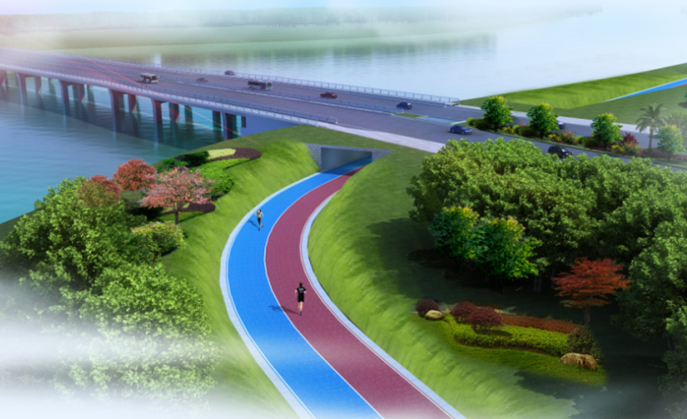 环东海域滨海旅游浪漫线在采用跨越方案时,选取轻盈、美观的桥梁造型,并采用透视效果好的栏杆外观,给参赛选手创造轻松愉悦的比赛环境,实现舒适跨越;采用下穿方案时,选用通透、舒适的支档型式,并利用景观植被对外露面美化,打造一条造型独特的下凹式景观带,完成景观穿越。其中中洲大桥、火炬大桥、万家春桥段均采用放坡U型槽方式实现下穿,既解决防潮、防水问题,又达到良好的景观效果,兼具实用性和观赏性。
