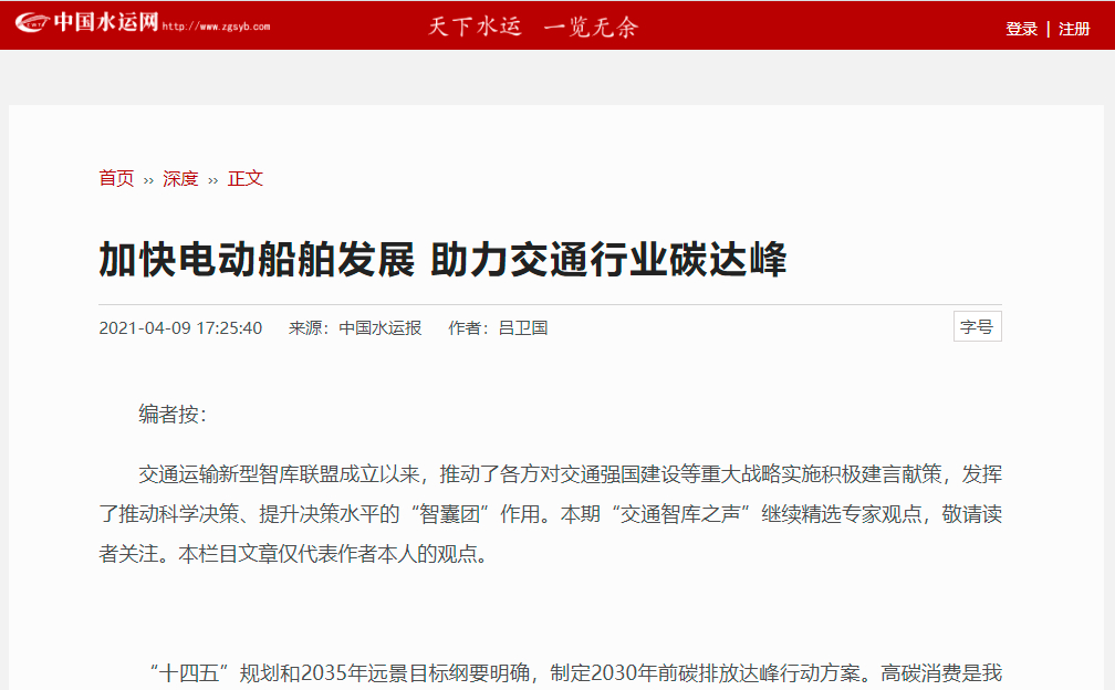 2020年10月,bevictor伟德集团正式成为交通运输新型智库联盟第一届理事会增补成员。加入智库后,集团高度重视并积极参与相关研究工作,围绕国家及交通运输行业热点议题献计献策。近日,集团环境科学研究院环境工程研究所所长吕卫国撰写的《加快电动船舶发展 助力交通行业碳达峰》通过智库遴选,于中国水运网刊载。