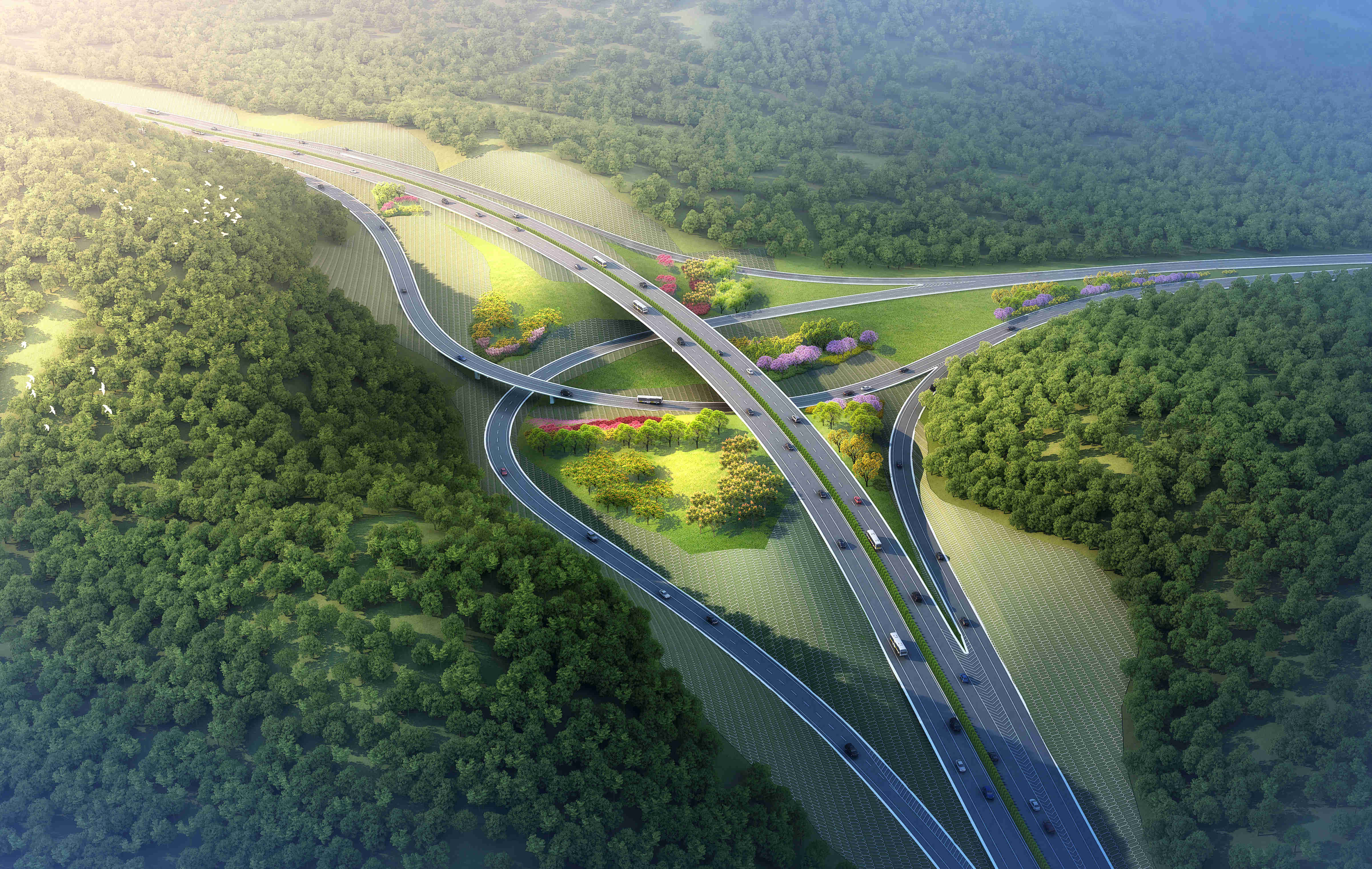 集团承担项目段公路工程勘察设计工作,包括路线、路基、路面、桥涵、隧道、交叉工程(含联络线)、交通工程及沿线设施、景观绿化工程设计等。秉承“绿色公路建设”理念,最大程度保护当地环境,提高周围土地利用率。