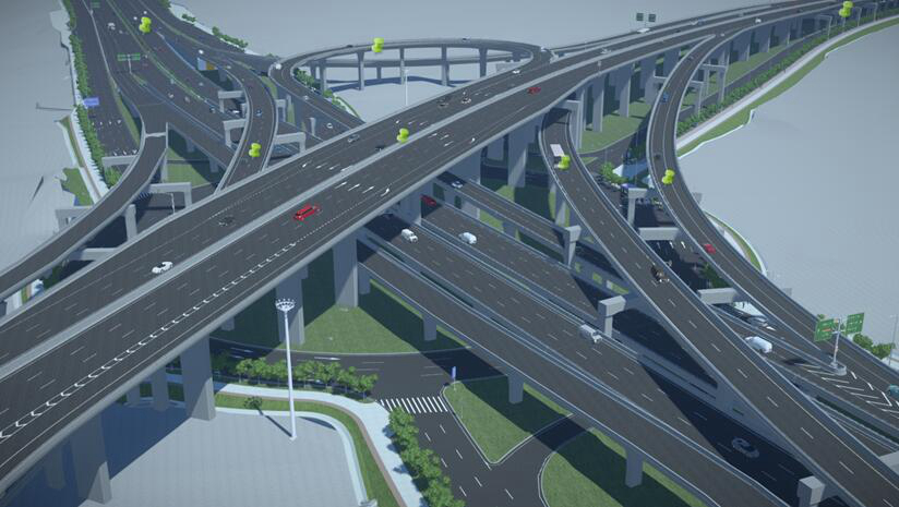项目团队在设计阶段引入BIM技术,利用ProjectWise协同工作平台,建立多层级文件架构,二三维设计资料、标准化文件、表单等数据集成化管理,实现多专业间协同设计和项目信息全生命周期传递。利用BIM三维建模,创建复杂节点模型,模拟设计效果,结合碰撞检测、视距分析等应用,合理布局复杂立交的主线与辅道系统,优化设计方案。