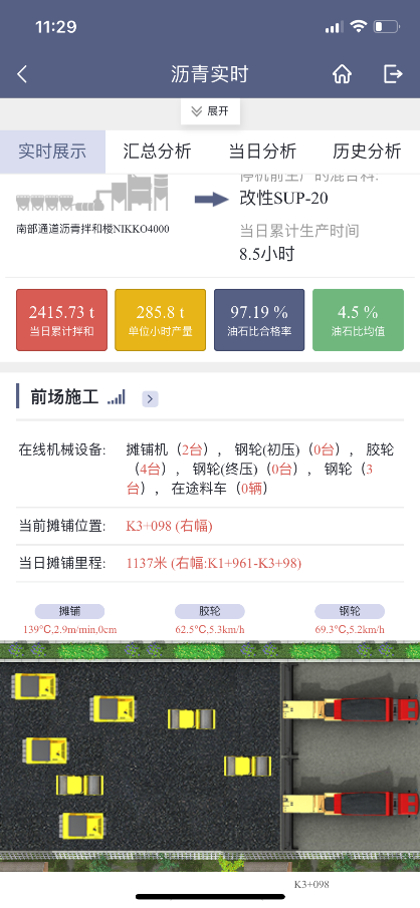 实时监控施工过程,包括碾压遍数云图、摊铺温度云图、摊铺厚度3D可视化及全过程关键数据的实时采集分析,实现了智能预警功能。