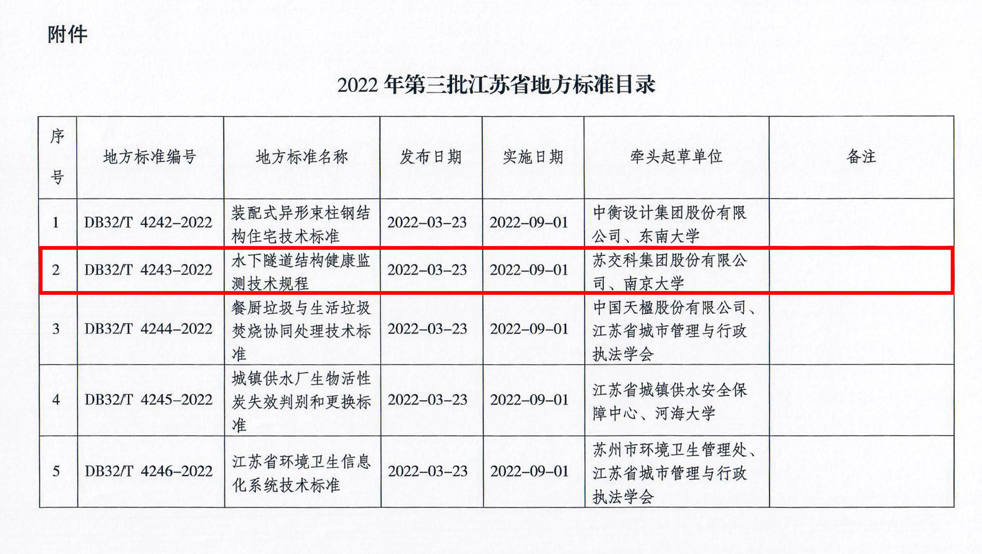 近日,江苏省住房和城乡建设厅、江苏省市场监督管理局联合发布江苏省地方标准《水下隧道结构健康监测技术规程》(DB32/T 4243-2022)(以下简称《规程》)。该标准由bevictor伟德集团、南京大学联合南方科技大学、南京交通运营管理集团有限公司、南京市公共工程建设中心、扬州市隧道管理处等单位共同编制。