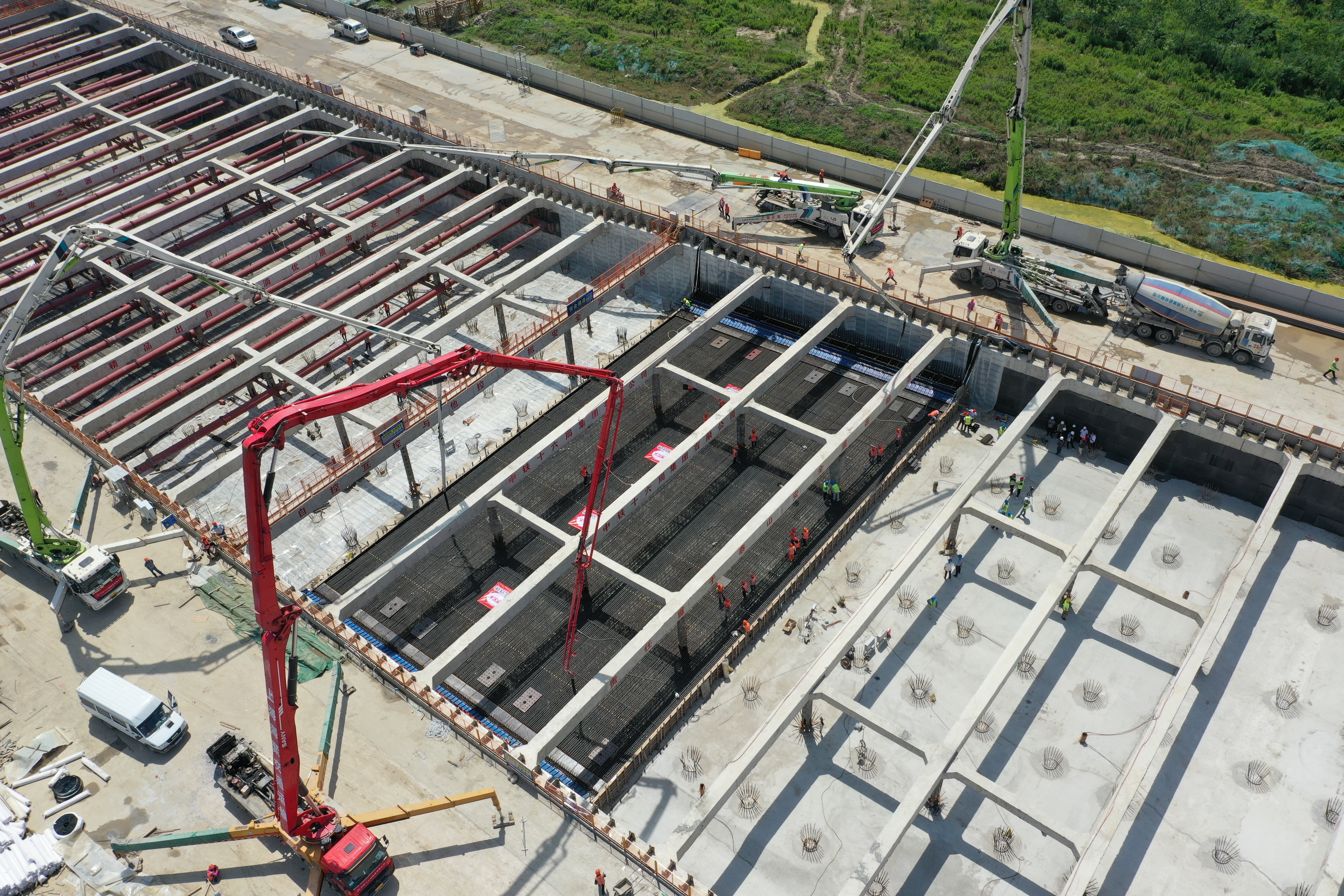 隧道底板是湖底隧道主体结构施工的关键环节。此次浇筑的陆域段首块底板长25米,宽44米,厚1.5米,混凝土一次性浇筑1650立方米,总浇筑面积1100余平方米,相当于三个篮球场大小。