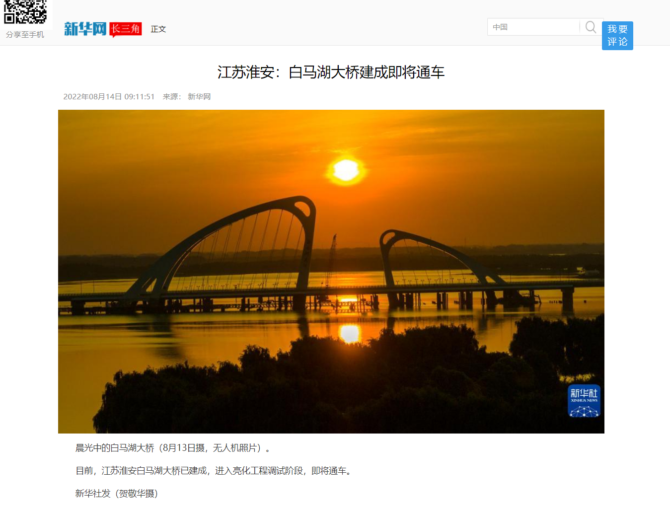 央媒关注丨交科设计承担设计的白马湖大桥即将通车!