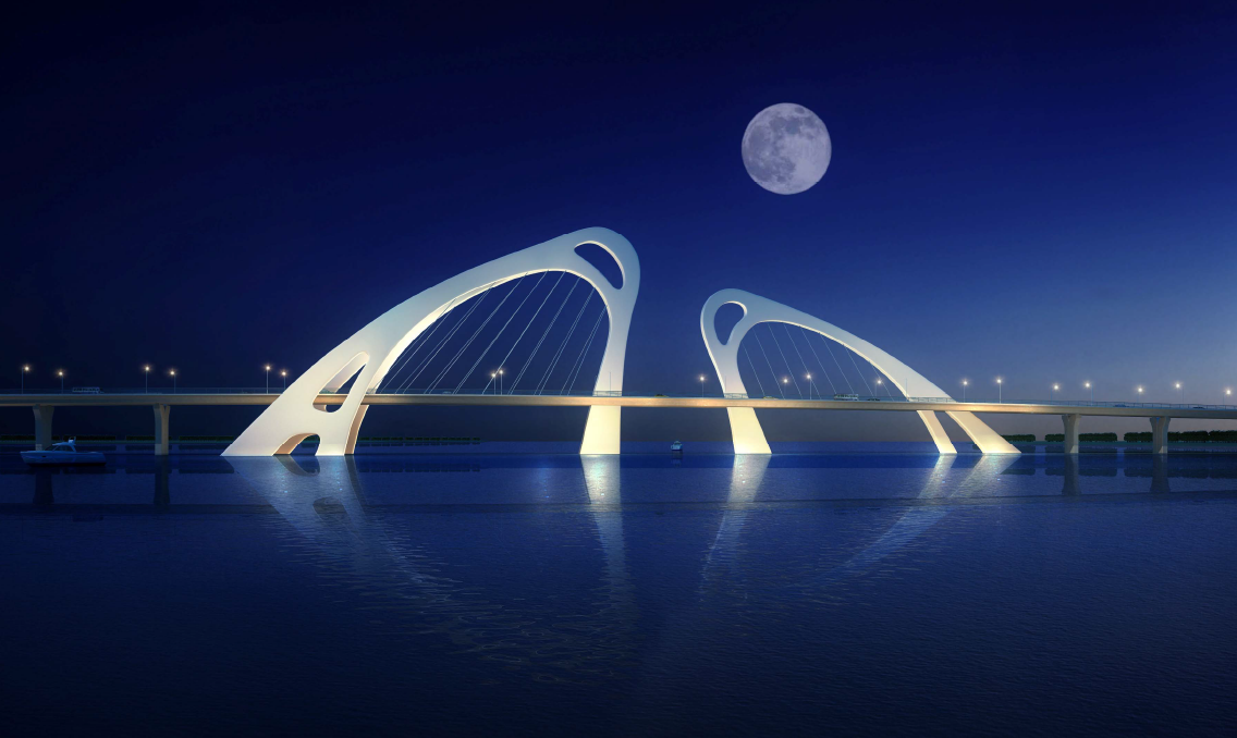 白马湖大桥为白马湖大道的关键节点工程,主跨71m,全长1033m,总投资约2.3亿元,桥梁连续跨越超1km的湖体。大桥设计秉持“新大桥、新景点”的理念,构建融桥入湖、和谐共生的设计意境,巧妙地将白马湖 “灵动、富饶、奋发”特质与民间传说“鱼跃龙门”相融合,抽象成独特的梁拱组合造型,远看宛如跃水而出,鱼跃龙门,与美丽白马湖融为一体,浑然天成。