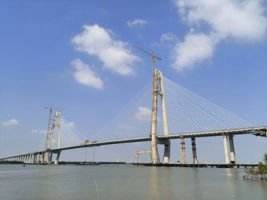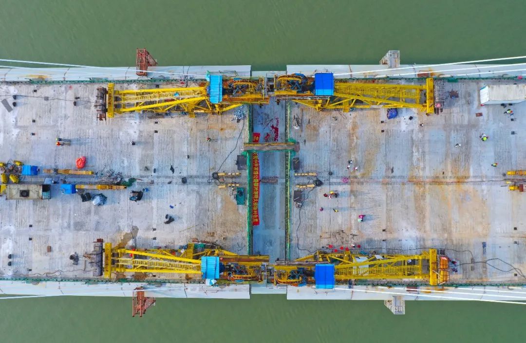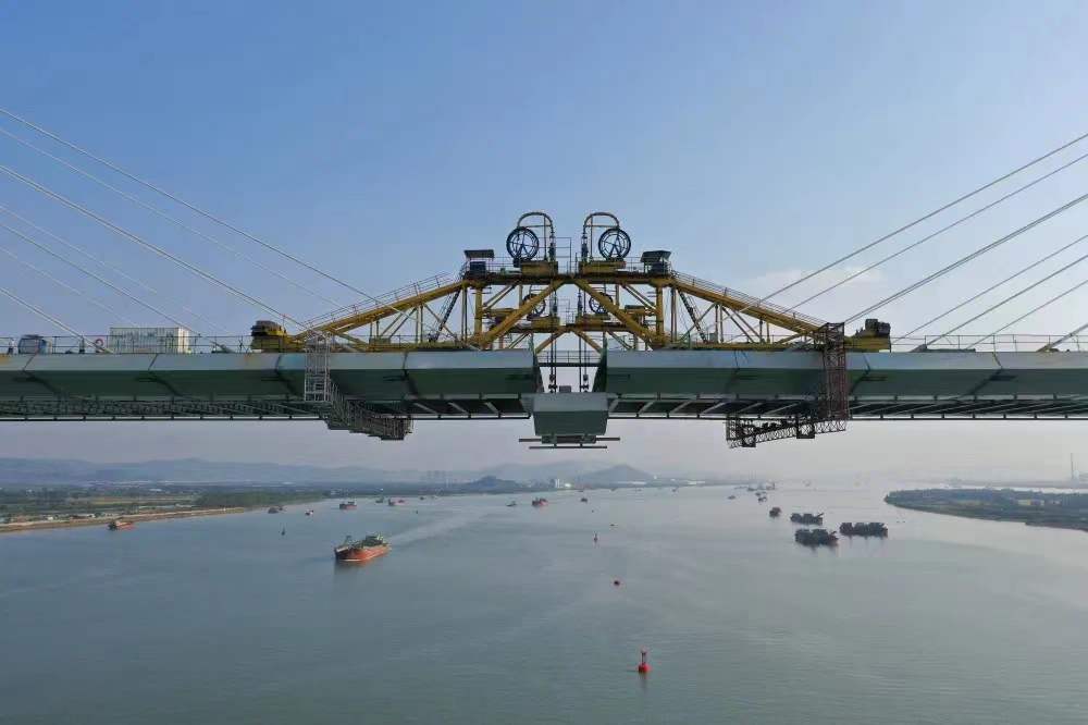 中开高速银洲湖特大桥自2014年开始前期研究,直至今日主桥合龙,历时近8年。集团项目组积极创新,提出了全国首创“不平衡双悬臂”施工方案,中跨采用桥面吊机整节段悬拼施工,边跨采用前支点牵索挂篮悬浇施工,取消了常规混合梁的边跨高支架,节约工程投资近千万。