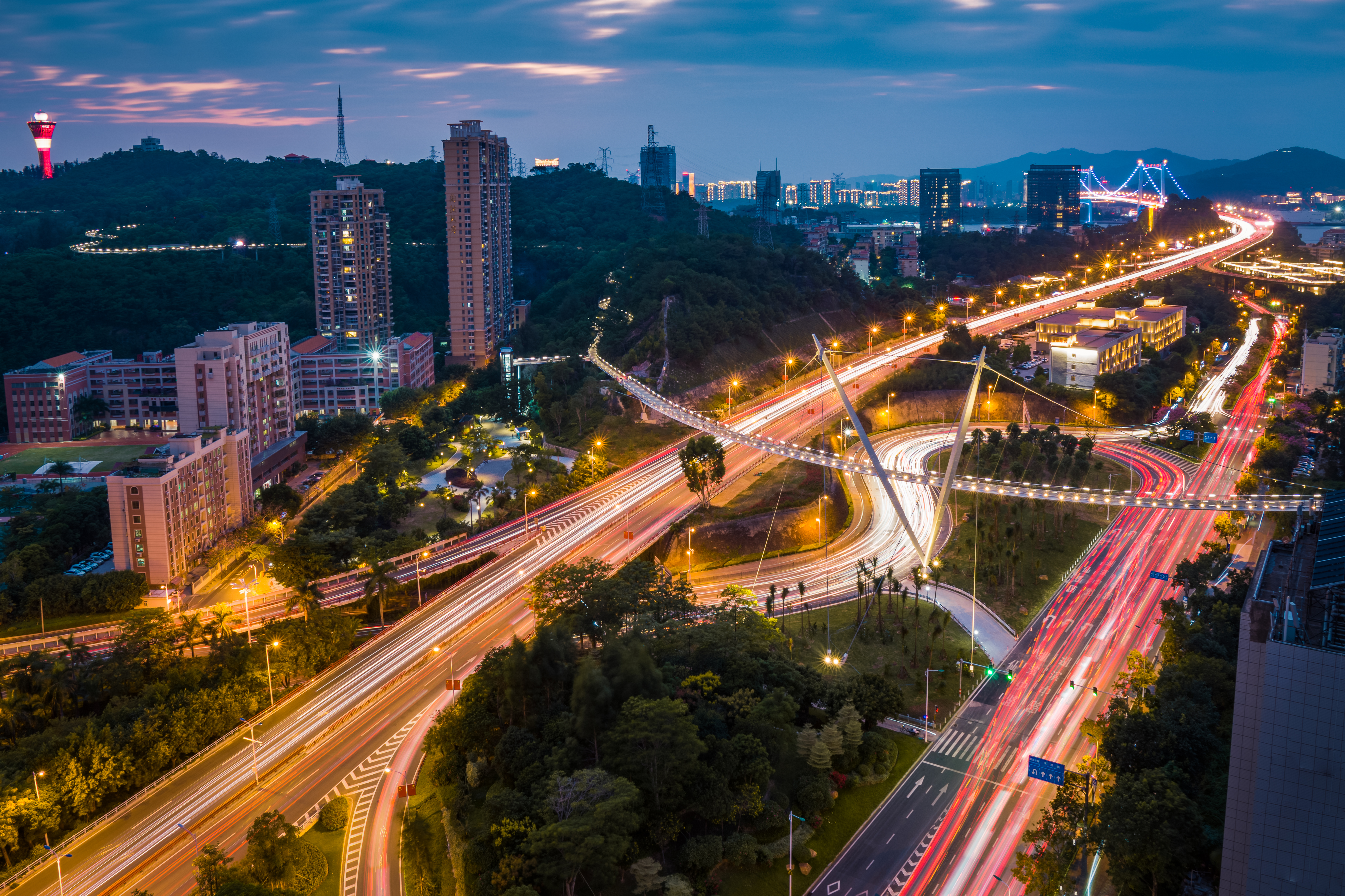 和美桥位于海沧大桥桥头,横跨仙岳路,首尾连接狐尾山、仙岳山,对厦门山海健康步道的东西向贯通起到极其重要的作用。从建筑语言上,和美桥将曲线梁与单塔悬索桥相结合,通过象征胜利的V型桥塔连同有序排列的索网、弯曲有度的桥面,如同双臂张开的怀抱,热情洋溢地拥抱着行人,欢迎远方的来客,充分展现厦门宾至如归的城市形象。桥梁周边的无障碍便民设施实现了行人与城市繁忙交通的分离,提供了畅行赏景的便利,让人与自然和谐共存,成为鹭岛西门户引人注目的地标建筑。