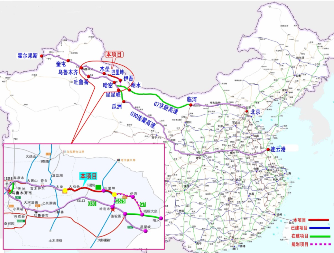 京新高速公路(G7)巴里坤至木垒公路建设项目位于新疆维吾尔自治区昌吉回族自治州木垒县和哈密地区巴里坤哈萨克自治县境内,是国家高速公路网G7北京至乌鲁木齐国家高速公路的重要组成部分,同时是新疆干线公路网的重要组成路段,是天山北坡区域公路网中最高层次的公路主通道。项目串联东天山生态农业与旅游发展带,对巴里坤县经济具有很大的带动作用。