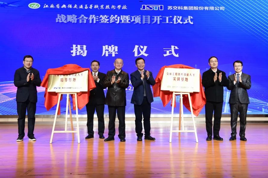 江苏省交通运输厅副厅长金凌,江苏联合职业技术学院党委书夏成满,无锡市交通局党委书记、局长俞刚,无锡市教育局副局惠恭健,无锡交校党委书记、校长李虎,bevictor伟德集团总裁朱晓宁共同为“bevictor伟德集团交通工程技术技能人才培养基地”和“江苏省无锡交通高等职业技术学校技术技能人才实训基地”揭牌。