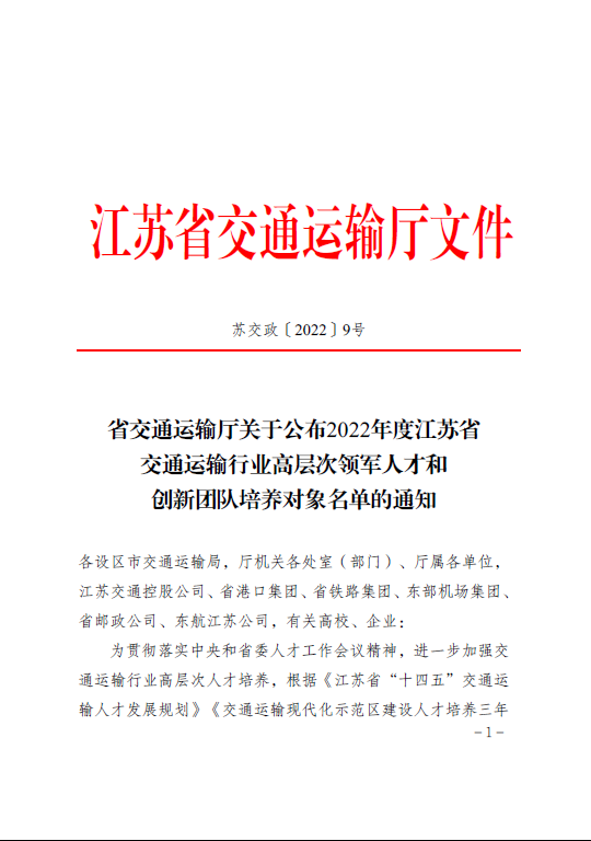 副主任李豪被纳入江苏省交通运输行业“高层次领军人才培养计划”名单和江苏省标准化专家库首批聘任专家名单。