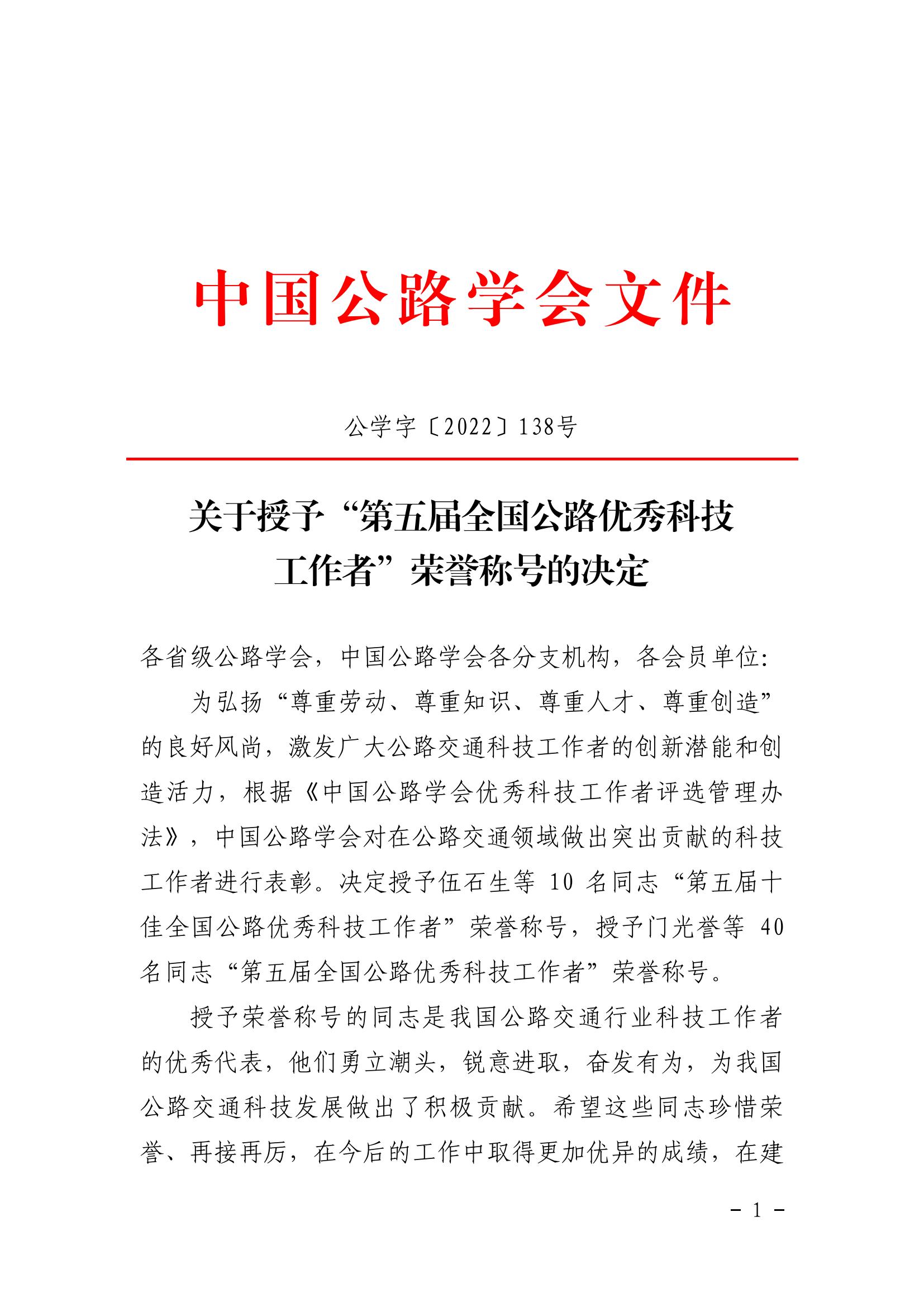 工程中心韦武举副主任荣获“第五届全国公路优秀科技工作者”称号。
