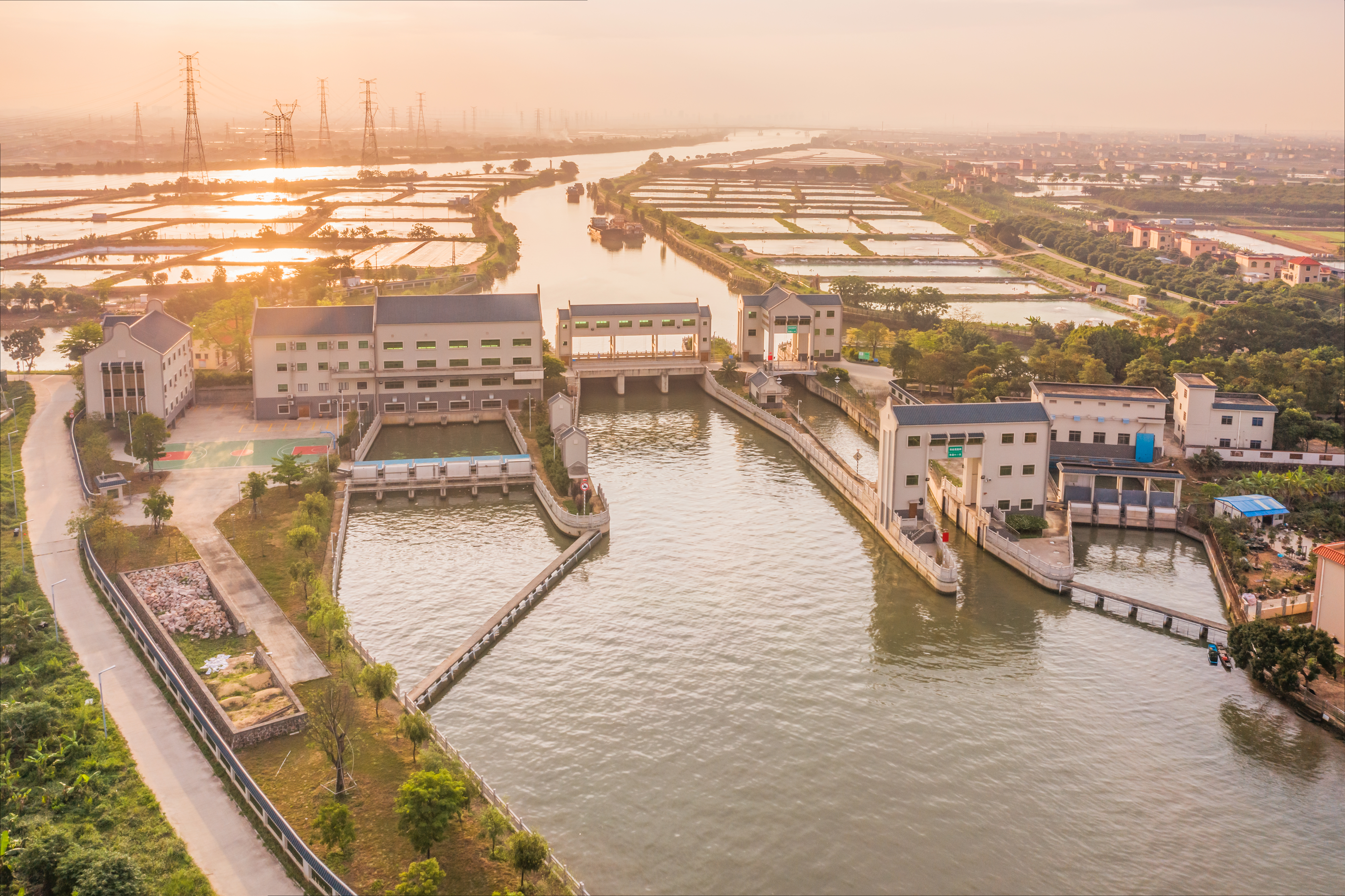 中山市阜沙镇鸦雀尾水利枢纽工程由鸦雀尾水闸、船闸和泵站组成,是一座集排洪、排涝、防洪潮、灌溉及通航于一体的水利枢纽工程,是五乡联围重要骨干工程。项目由南岸至北岸依次布置船闸、水闸和泵站,船闸与水闸、水闸与泵站之间均设有中心岛,各建筑物相互独立。