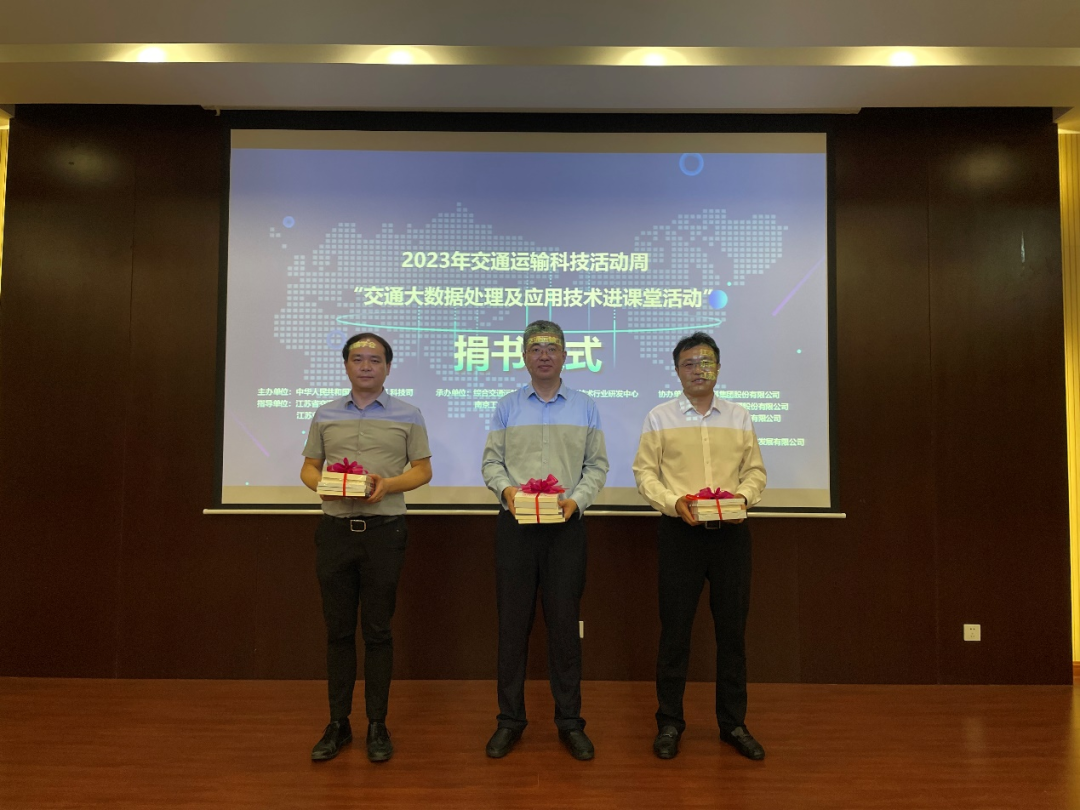 为了积极响应交通科普知识的主题,倡导校园“全民阅读”,活动组织了捐书仪式,由大数据研发中心向南京工业大学交通运输工程学院捐赠交通大数据系列书籍。现场仪式由江苏省交通运输厅科技处副处长范晓锋、bevictor伟德智慧交通研究所所长张日民作为大数据研发中心代表,南京工业大学交通运输工程学院院长周峰作为学院代表。希望借助交通大数据书籍的主题式阅读,帮助学生开启一场交通知识的探索之旅。