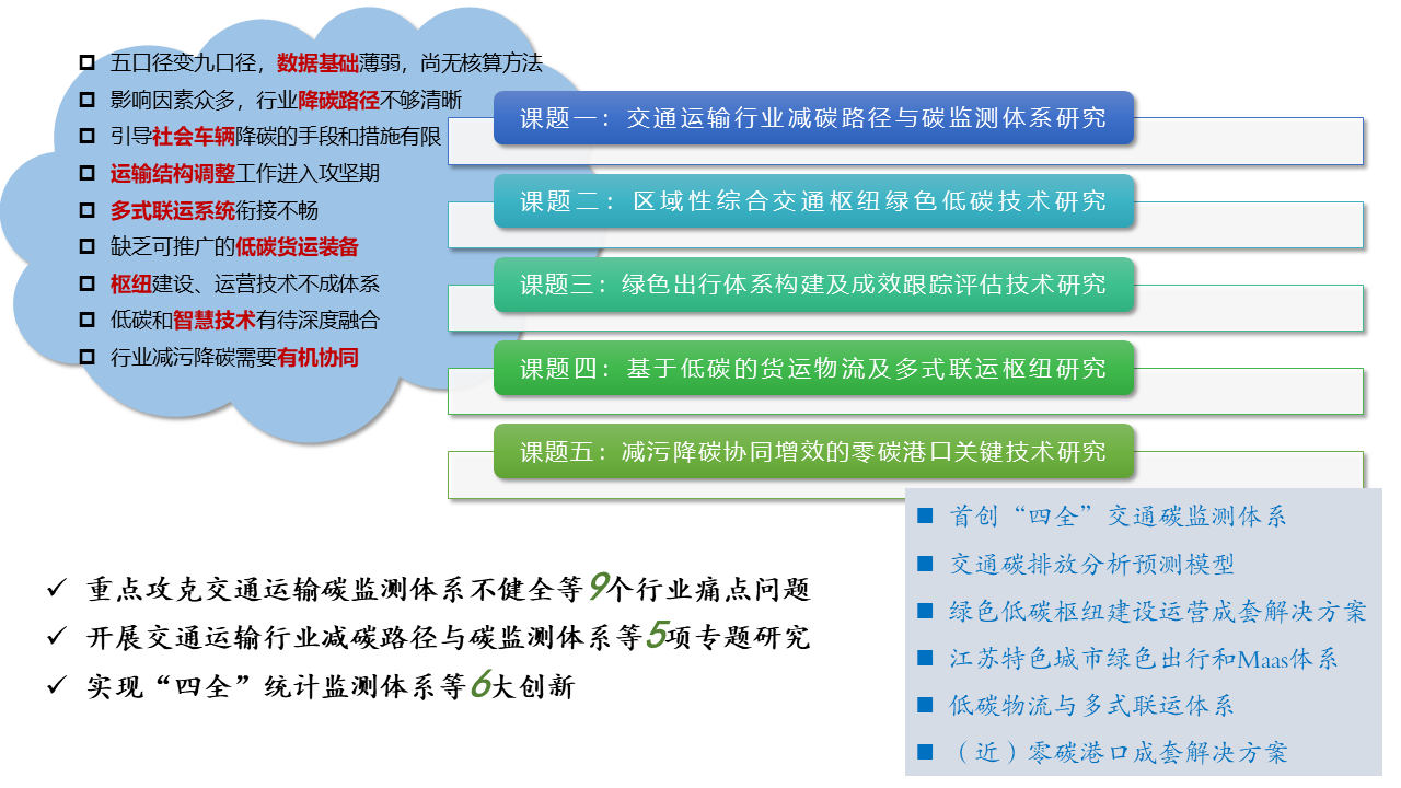 该项目围绕我省“一中心一基地一枢纽”工作部署,以交通运输碳达峰碳中和为导向,以研究形成绿色低碳综合交通枢纽成套解决方案为目标,构建“956”研究体系:即重点攻克交通运输碳监测体系不健全、减碳路径尚不明晰、综合交通枢纽绿色低碳技术未成体系等9个行业痛点问题,开展交通运输行业减碳路径与碳监测体系、区域性综合交通枢纽绿色低碳技术等5项专题研究,实现“四全”统计监测体系、全生命周期理念下绿色低碳客运和货运枢纽建设方案等6大创新,为交通运输领域深度减碳提供技术支撑。