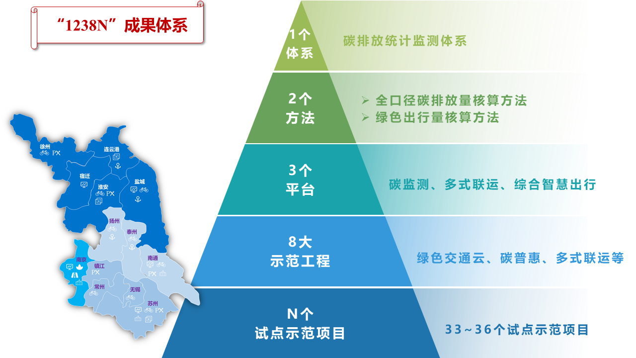 在956研究体系下,通过17项关键课题研究工作,取得“1238N”成果体系:即构建1个碳排放统计监测体系,形成全口径碳排放量和绿色出行量2个数据核算方法,建成碳监测、多式联运、综合交通智慧出行3个服务平台,建设8大示范工程和N个试点示范项目,为行业减碳降碳提供可复制的解决方案和样板示范。