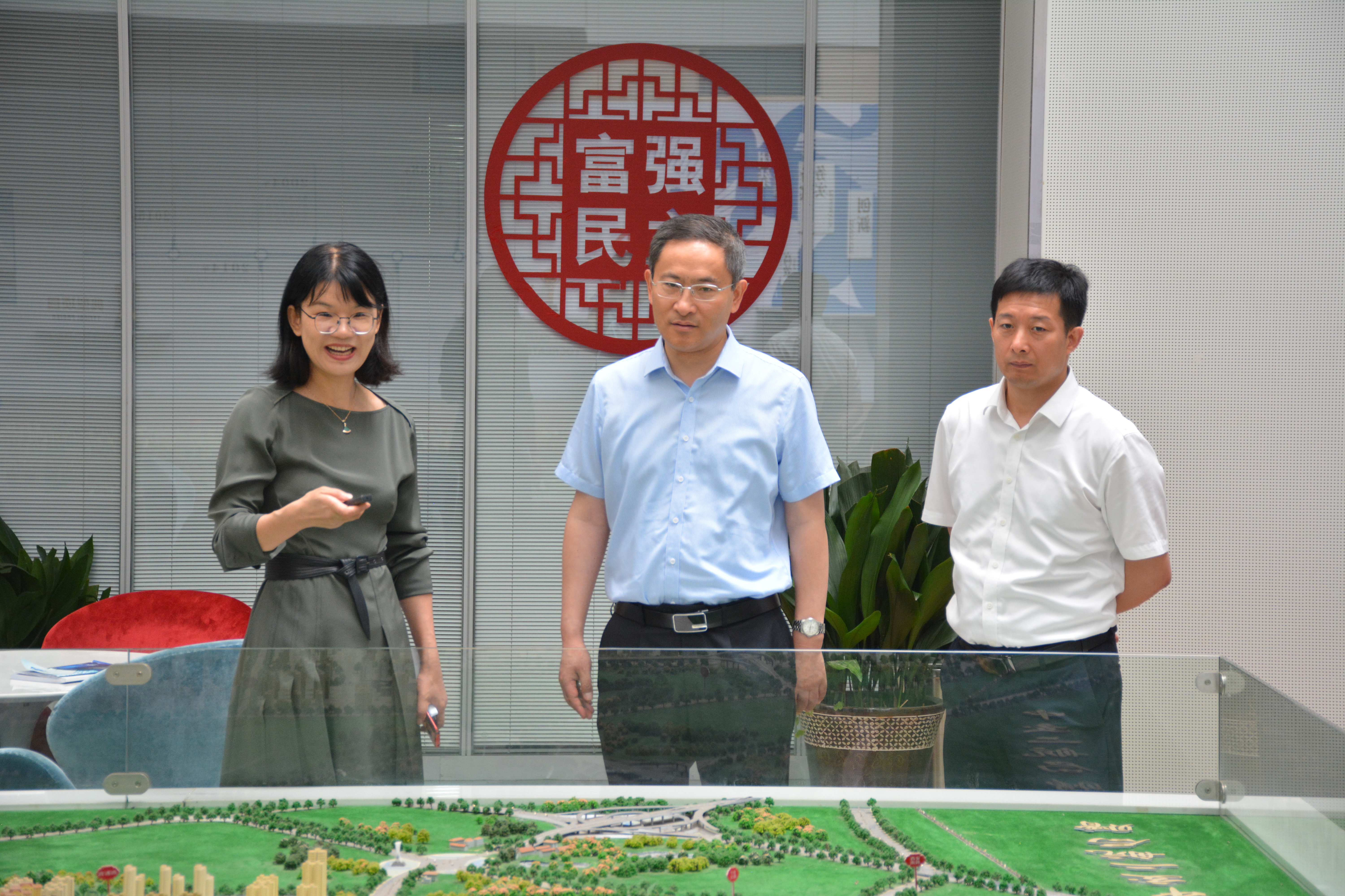刘爱国主任一行参观了企业文化墙及快速路沙盘,详细了解了交科设计的历史沿革、市场布局、企业经营工作及重点设计项目等情况。